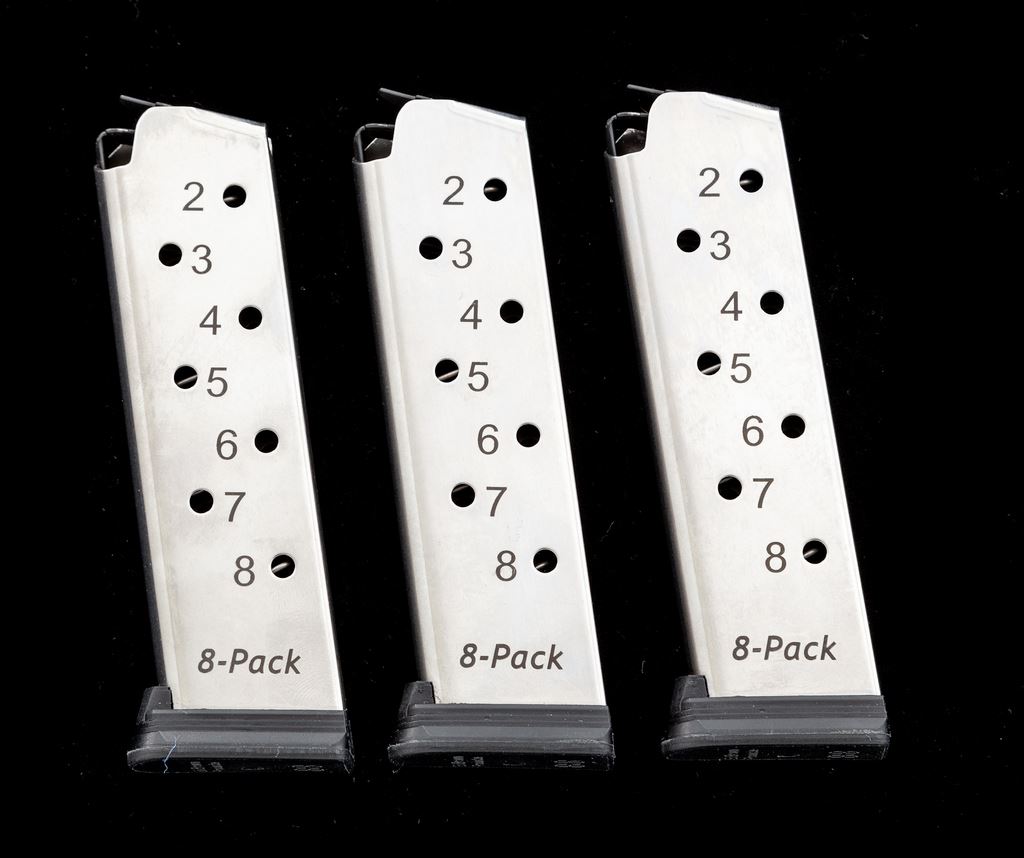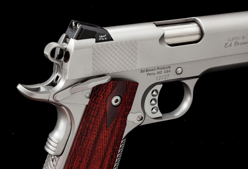 Outstanding Ed Brown Custom Kobra Semi-Automatic Pistol, #13127, .45 ACP cal., 5'' barrel, matte stainless finish; rear slide serrations, front and back strap with ''snakeskin'' type texture to the metal. Also featuring checkered double diamond wood grips, skeletonized hammer and trigger, ambidextrous thumb safety, 3-dot Trijicon night sights, and four (4) Ed Brown magazines: one (1) 7-round and three (3) 8-round. Includes the original owner's manual. Pistol is in excellent near new overall condition. Exposed portion of barrel at the ejection port with some minor rub marks from cycling the action; otherwise the slide, frame, and grips appear as new. Grip checkering is sharp and shows no visible wear. Chamber area with some powder residue as evidence of being fired; action is smooth with an excellent bore. Est.: $1,800-$2,400. (Modern/PPT)