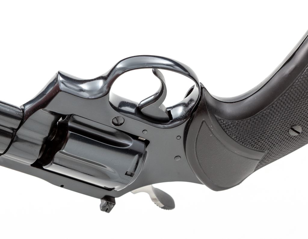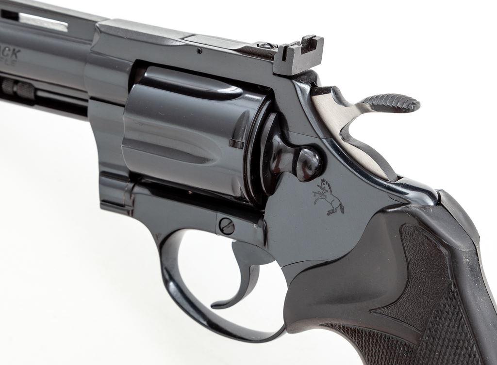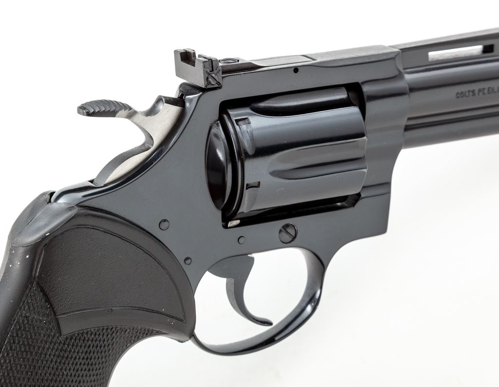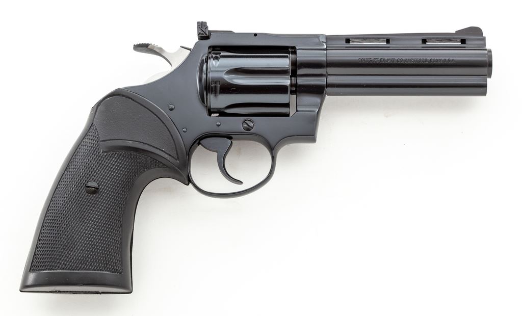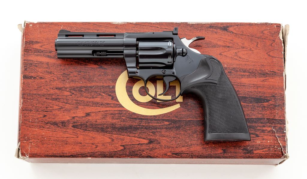 High Condition .22 Caliber Colt Diamondback Double Action Revolver, #S61588, 4'' vent rib barrel, blue finish, checkered black rubber Pachmayr ''Presentation'' grips, ramped front sight, and fully adjustable square notched rear sight. In the original simulated woodgrain box with matching end label, styrofoam insert, instruction manual, yellow hang tag, and other misc. factory paperwork. Mfg'd 1980. Condition is excellent with approx. 99%+ original blue finish. Metal shows only a few minor handling marks. Cylinder with only a very faint turn line. Grips show minor marks from handling. Bright and shiny bore rates as excellent. Box and label shows some storage wear mainly along the edges. If this revolver was fired, it was fired very little. Est.: $1,400-$1,800. (Modern) (Not available to Calif. residents.)