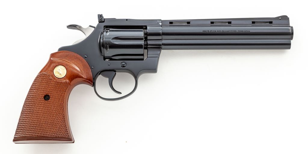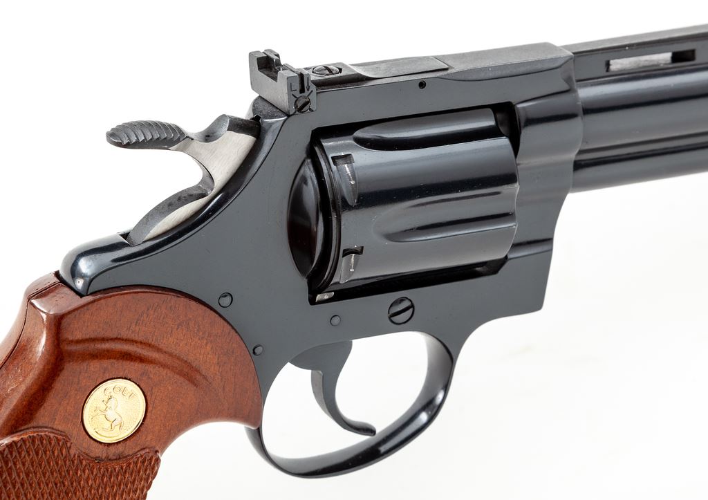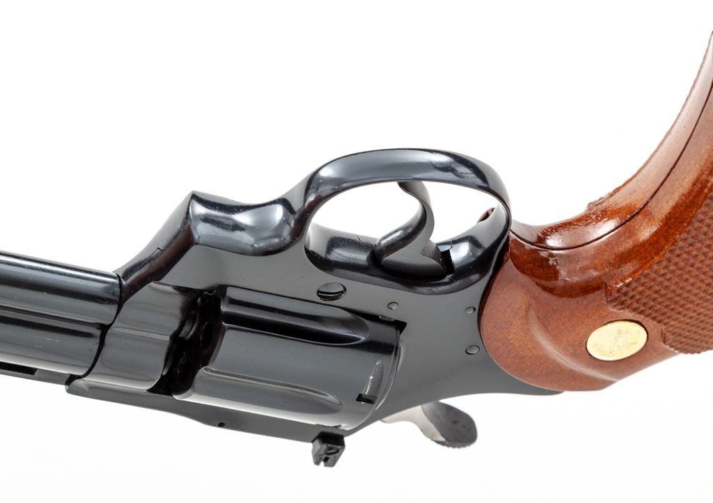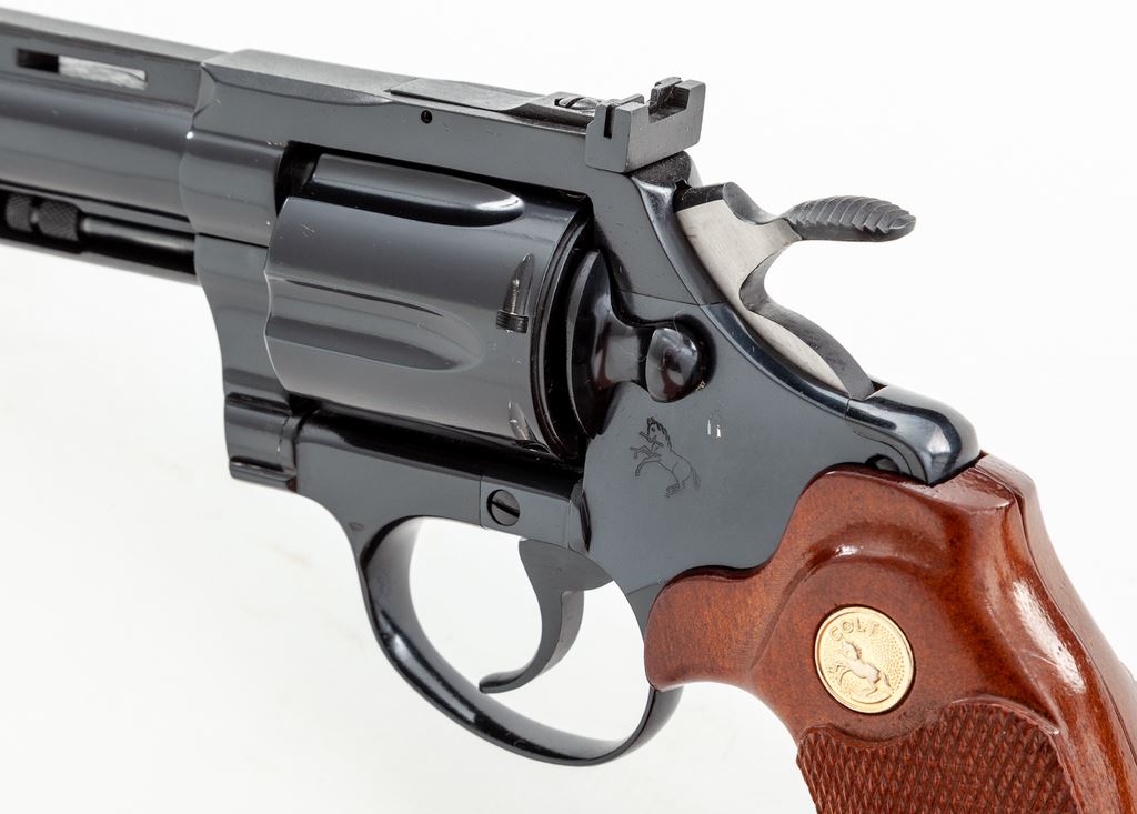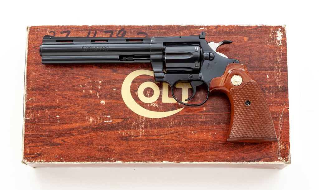 High Condition .22 Caliber Colt Diamondback Double Action Revolver, #R43160, 6'' vent rib barrel, blue finish, factory checkered walnut grips with gold Colt medallions, ramped front sight, and a fully adjustable square notched rear sight. In the original simulated woodgrain box with matching end label, styrofoam insert, and instruction manual. Mfg'd 1978. Condition is excellent with approx. 99% original blue finish. Metal shows a few slight scratches and handling marks, most noticeable on left side of frame near the Colt logo, and an approx. .75'' shallow vertical scratch on right side of frame behind the recoil shield. Cylinder with only a faint turn line, appearing to have been fired very little. Grips are also excellent showing only a few minor marks from handling; checkering is clean and sharp. Bright and shiny bore also rates as excellent. Box shows some storage wear mainly along the edges; top with additional numbers written in black sharpie; blank end flap has detached from the box but is still present. Est.: $1,400-$1,800. (Modern) (Not available to Calif. residents.)