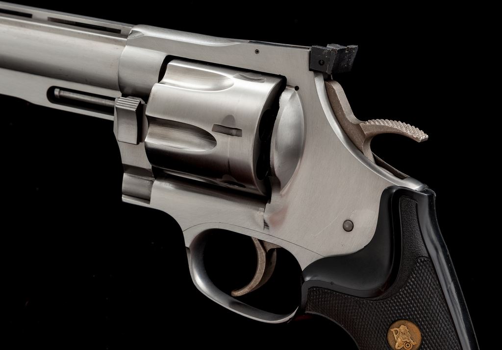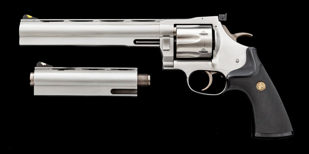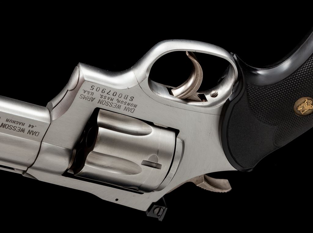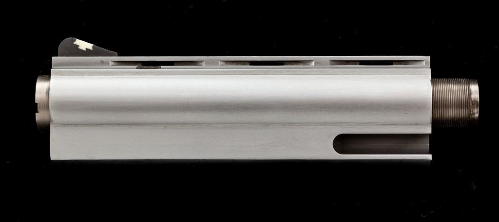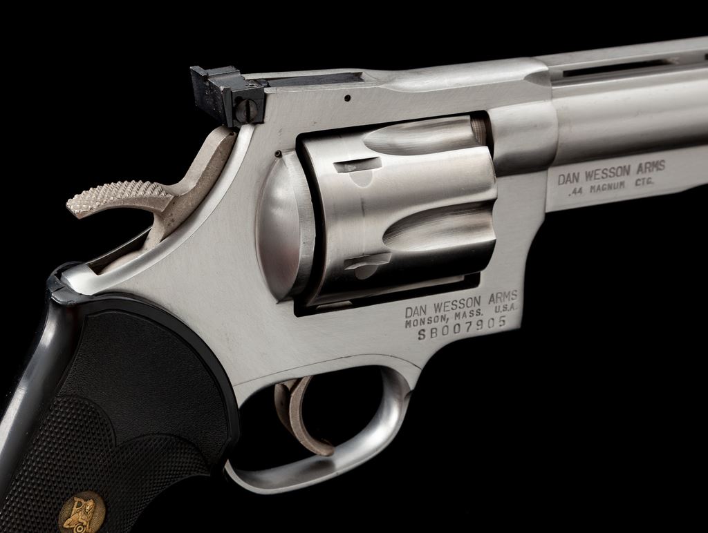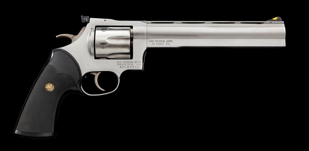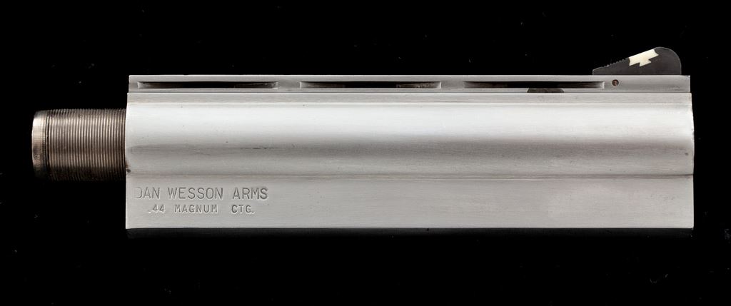 Dan Wesson Large Frame Double Action Revolver, #SB007905, .44 mag. cal., 6'' & 8'' stainless steel barrels, stainless steel, Pachmayr checkered rubber grips, yellow ramp and adjustable rear sight, with barrel bushing tool and feeler gauge. In its original briefcase-style transport case. Condition is excellent showing just very light general use. Good grips and action, bores are bright. Inside of case with moderate general soiling to goldenrod velvet lining; exterior of case with some scuffing. Est.: $800-$1,200. (Modern/PPT)