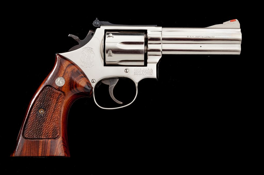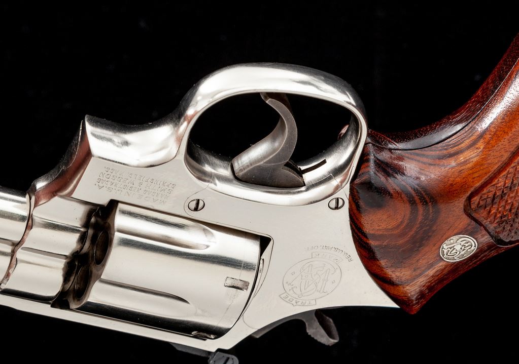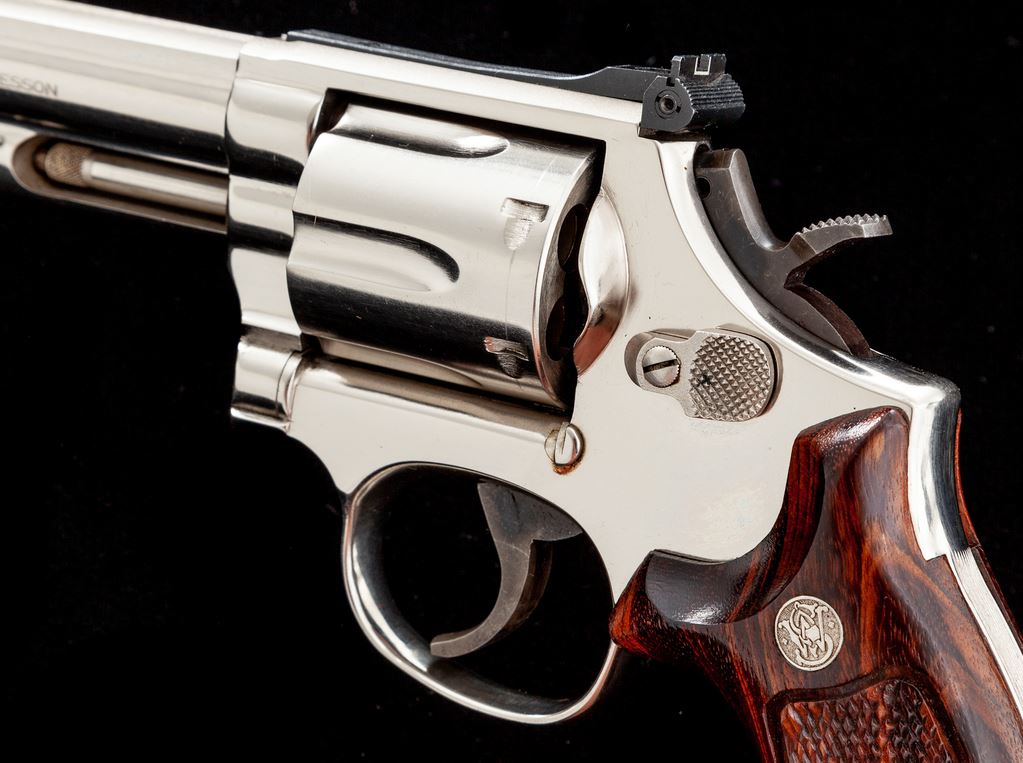 Smith & Wesson Model 586 Double Action Revolver, #AAA7143, .357 mag. cal., 4'' barrel, nickel finish, factory checkered grips with S&W medallions, red ramp front and white outline rear sight, standard trigger and hammer. In period-correct box without label. Condition is excellent, appearing new and only factory test fired. Est.: $600-$800. (Modern/PPT)