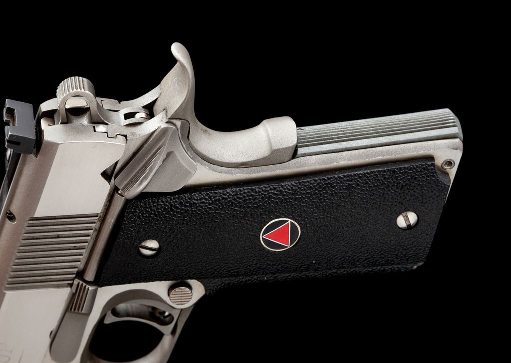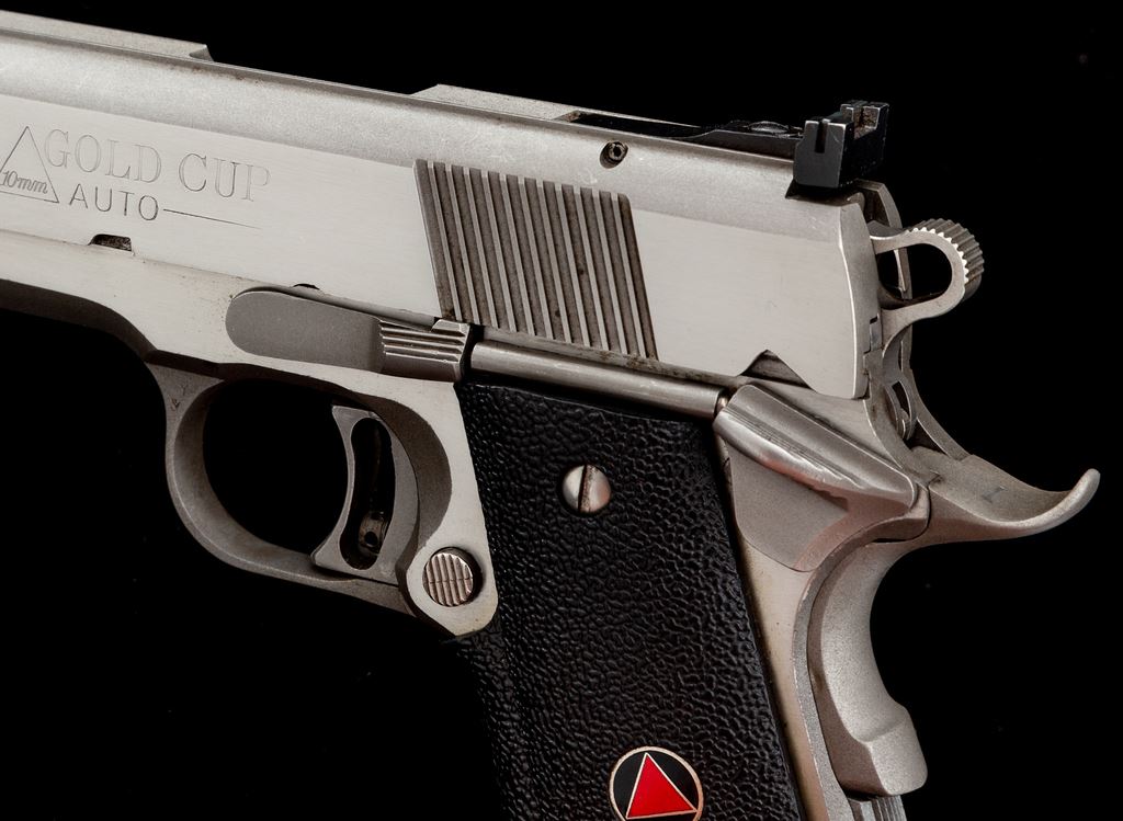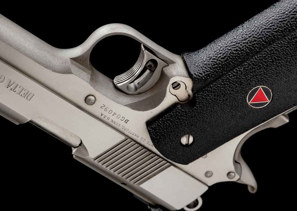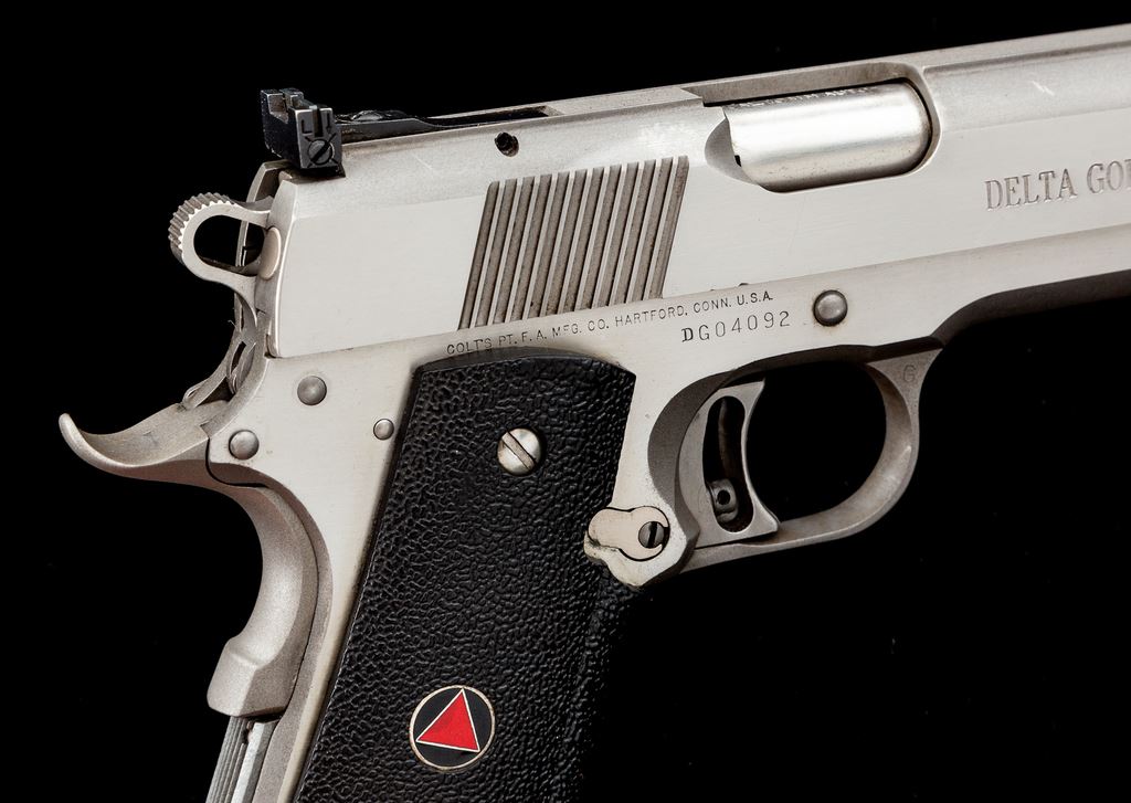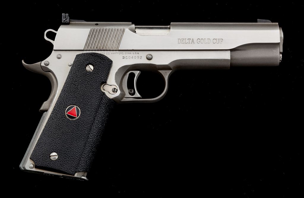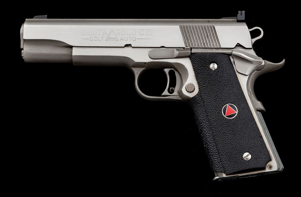 Colt Delta Gold Cup Semi-Automatic Pistol, #DG04092, 10mm cal., 5'' barrel, stainless finish, factory wrap around black rubber grips, skeletonized hammer and trigger, fixed front sight, fully adjustable rear sight, and one stainless Colt magazine. Metal surfaces rate very good and shows signs of moderate range use with general light scratching and scuffs, predominantly on the slide; right lower edge with a tiny impression. Grips are near excellent. Action is smooth with an excellent bright bore. Est.: $800-$1,200. (Modern/PPT)