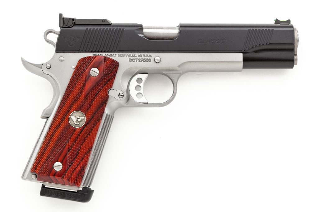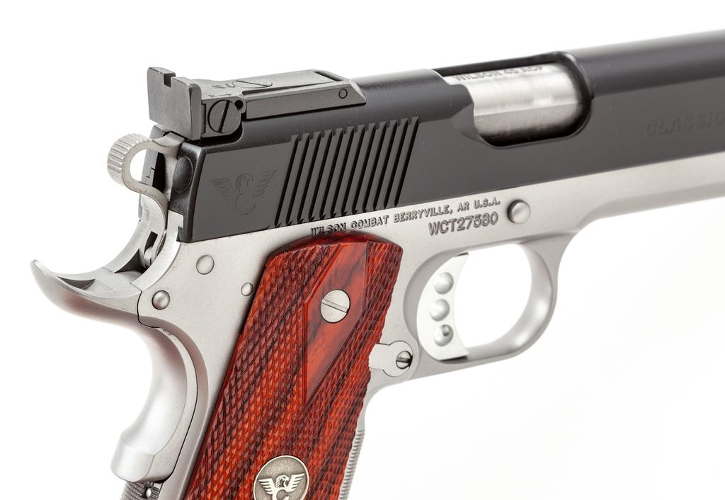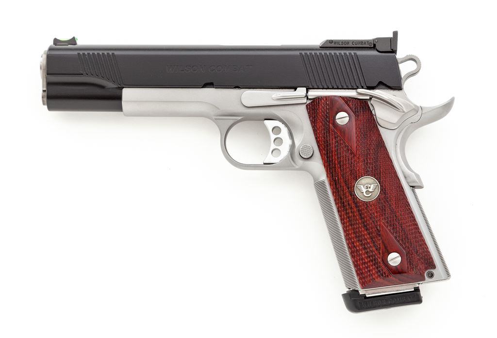 Excellent Wilson Combat Classic Semi-Automatic Pistol, #WCT27580, .45 ACP cal., 5'' barrel, black ''Armor-Tuff'' finished slide, stainless frame, barrel, and bushing; checkered double diamond cocobolo grips with WC medallions, front and rear slide serrations, skeletonized hammer and trigger, finely checkered front and back strap, low profile thumb safety, green fiber optic front sight, square notched fully adjustable rear sight, and two (2) stainless 8-round Wilson Combat magazines with black base pad. Included is the original owner's manual and other misc. factory paperwork. Right grip with one tiny chip to the front edge, otherwise this pistol is in near new overall condition. Exposed portion of barrel at the ejection port with some moderate rub marks from cycling the action; frame, slide, and grips show only a few slight handling marks. Nice smooth action; chamber and bore are both clean. Overall appears to be a very lightly used and well cared for pistol. Est.: $2,000-$3,000. (Modern/PPT)