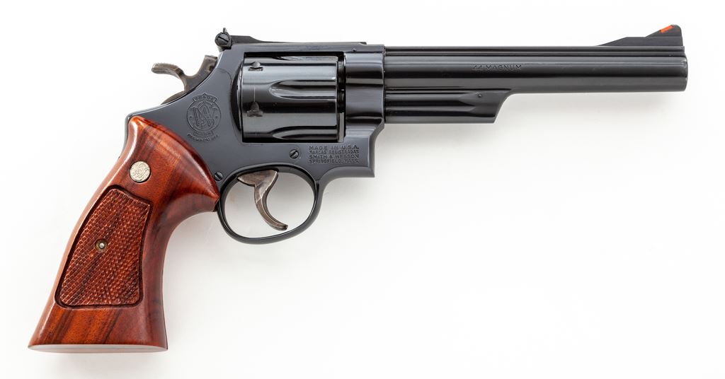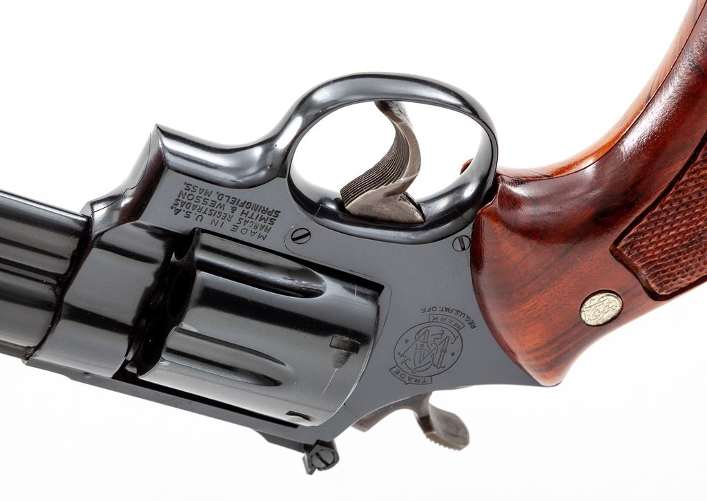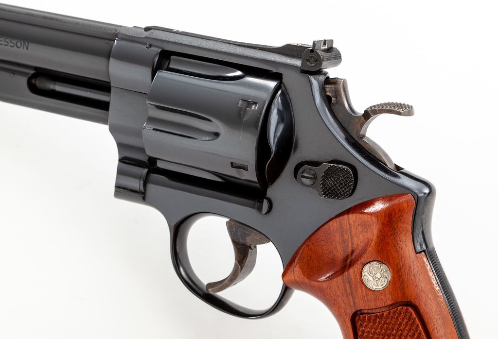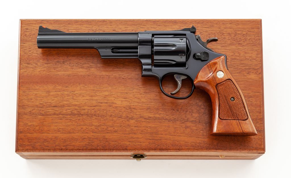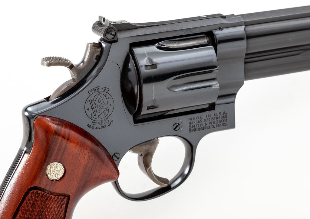 Cased Smith & Wesson Model 29-2 Double Action Revolver, #N353096, .44 mag. cal., 6.5'' pinned barrel, blue finish, factory checkered Goncalo alves target grips with S&W medallions, red ramp front sight, white outline micrometer click adjustable rear sight, with checkered wide spur hammer and wide serrated trigger. In original wood case with fitted blue interior, owner's manual, cleaning rod, screwdriver, other misc. factory paperwork, and brown cardboard box with matching end label. Mfg'd approx. 1975-1976. Condition is excellent with approx. 98% original blue finish; metal with a few minor handling marks on the barrel; cylinder with a thin index line. Factory lettering with clean crisp edges. Grips appear near new with sharp checkering and only a few slight handling marks; right grip is darker in color. Majority of the bright case colors remain. Action is crisp with an excellent bright bore. Interior of wood case shows moderate wear; exterior is in really nice shape and shows only a few small storage marks. Est.: $900-$1,200. (Modern/PPT)