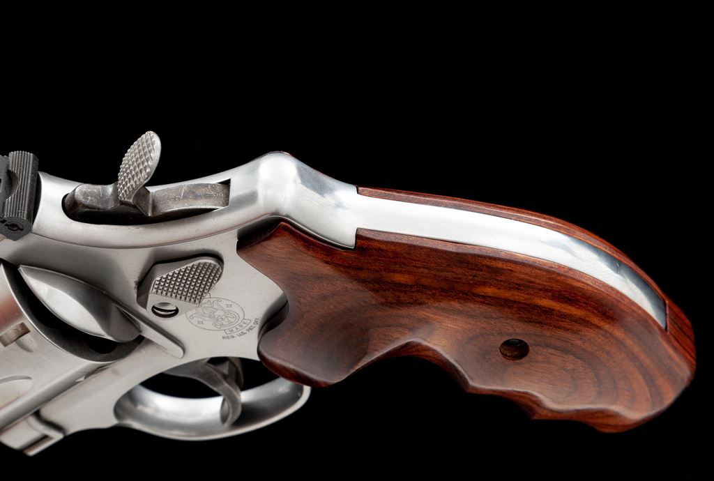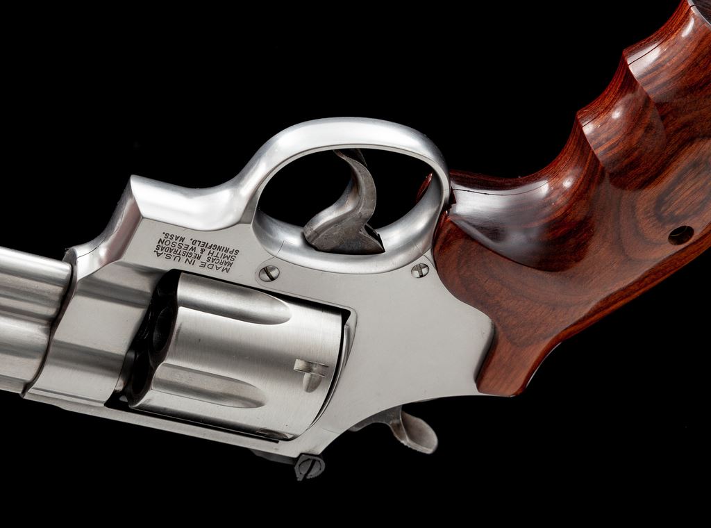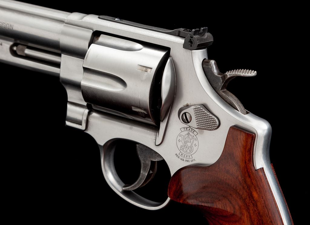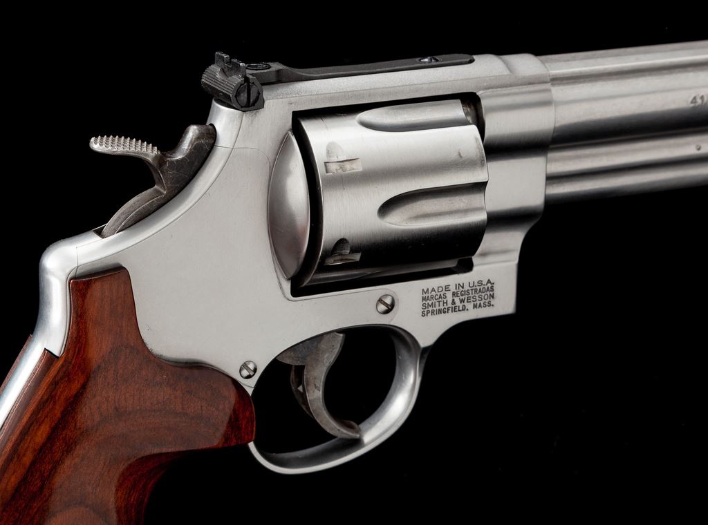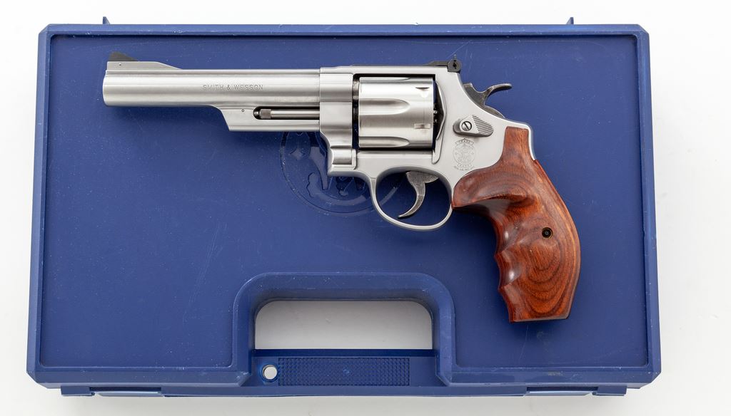 Smith & Wesson Model 657-4 Double Action Revolver, #CCZ1244, .41 mag. cal., 6'' barrel, satin stainless steel, laminate finger-grooved wood grips, ramped front sight and square notched fully adjustable rear sight. In original blue plastic case with matching end label and owner's manual. Revolver rates as fine and shows normal signs of moderate range use. Metal with scattered light micro-scratching; cylinder with a moderate index line and some spots of powder staining. Grips with nearly all of their semi-gloss finish; left grip with a few tiny impressions from handling. Action is crisp with a near excellent bright bore. Est.: $500-$750. (Modern) (Not available to Calif. residents.)