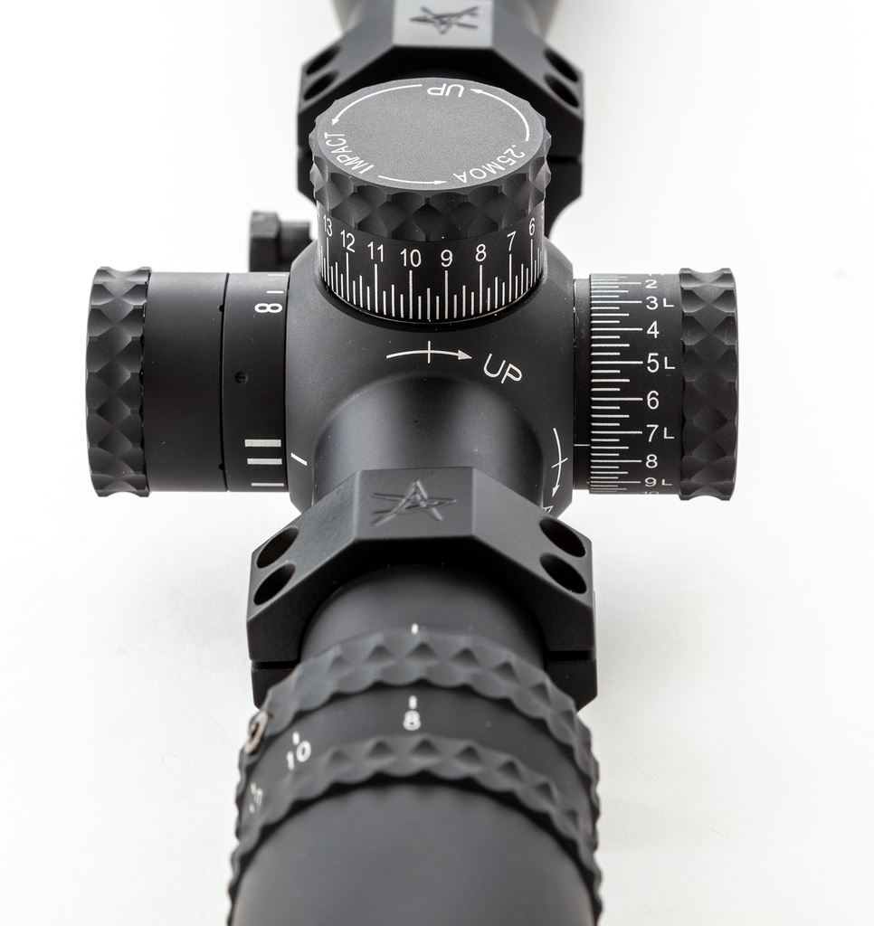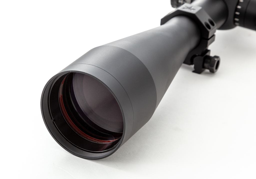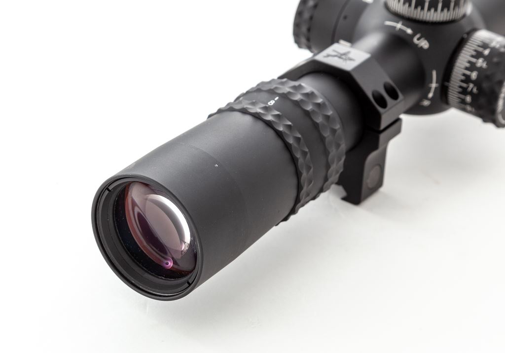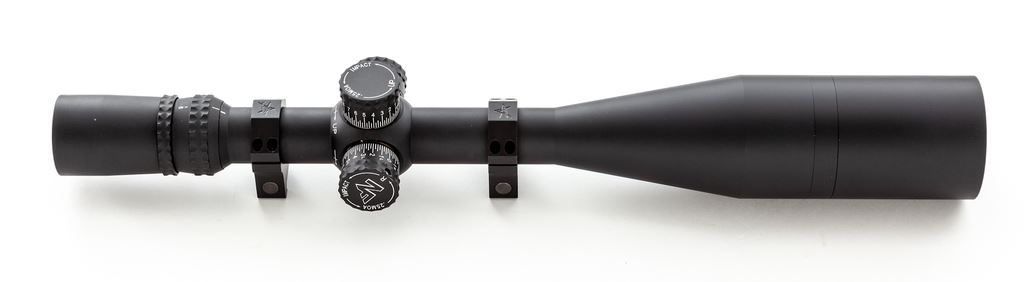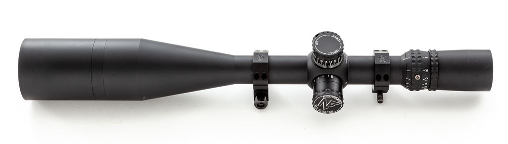 Nightforce NXS 8-32x56mm Rifle Scope, with NP-R1 reticle. Scope features .25 MOA, side parallax adjustment, sunshade, matte black finish, illuminated reticle, NF rubber lens covers, with Volquartsen Picatinny rings. Overall length including sunshade is 18-7/8''; without 15-7/8''. Included is the digital and printed owner's manual and NF stickers. In excellent overall condition showing only a few light marks to the exterior, with bright and clear optics; illumination feature functions properly. It should be noted that the rear scope ring needs replacement or repair as the horizontal bolt that holds the clamps has damaged threads. Scope itself appears near new. Est.: $1,000-$1,500