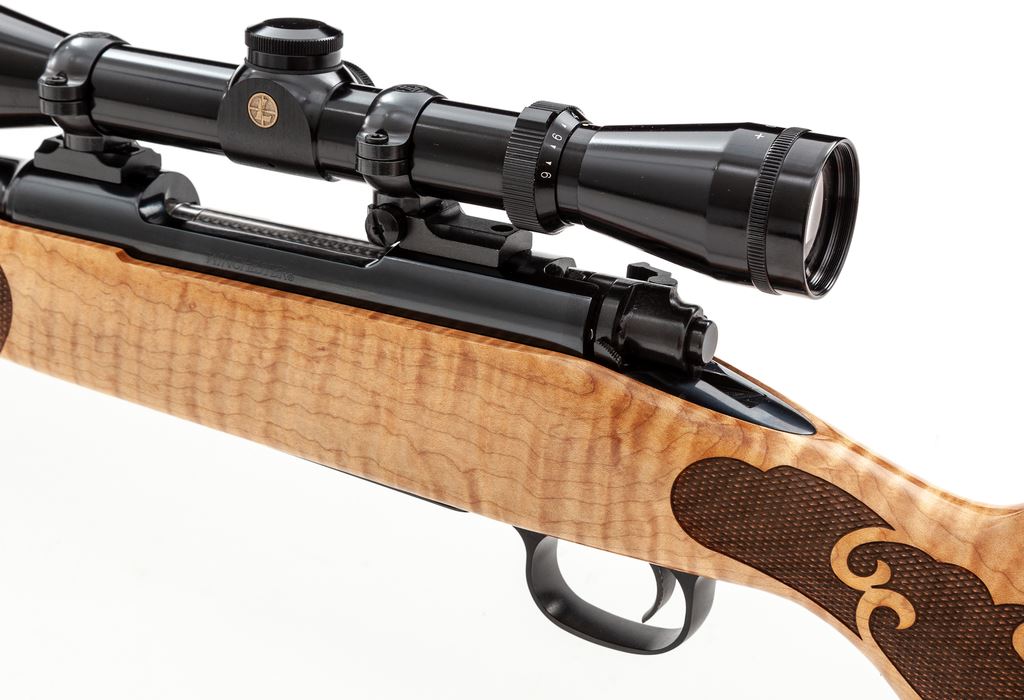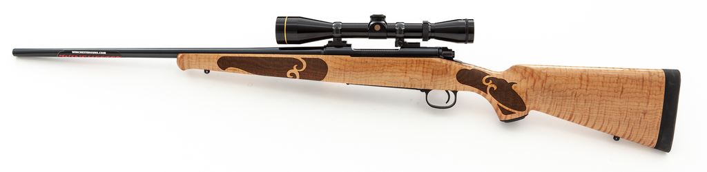 Winchester Model 70 Featherweight Bolt Action Rifle, #35GZR09170, .270 cal., 22'' barrel, blue finish, factory checkered maple stock, with black rubber butt pad. Topped with a Leupold Vari-X II 3-9x40 scope on Leupold rings and mounts, with Leupold rubber scope cover. Mfg'd in Portugal by Browning. Condition is excellent, appearing as new and unfired, with some factory stickers still remaining to bottom of barrel. Est.: $750-$1,000. (Modern)