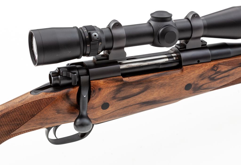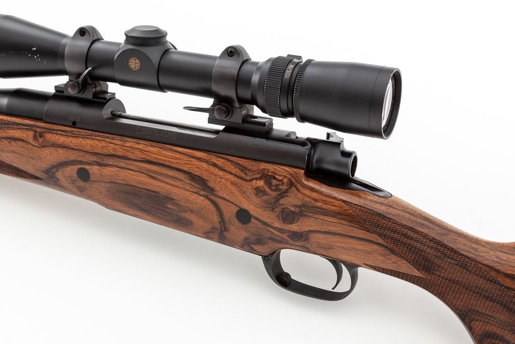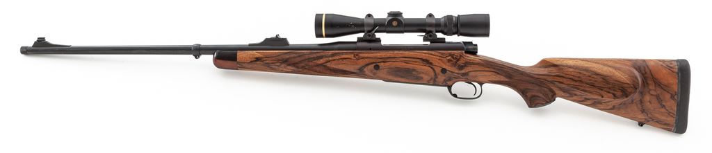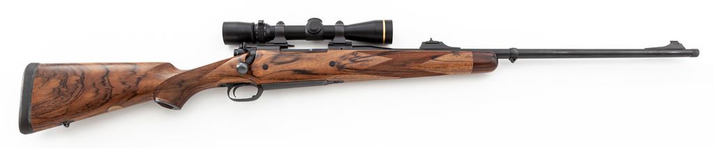 Custom Dakota Arms Model 76 Classic Bolt Action Rifle, with Leupold scope, #0249, .300 Win. mag. cal., 24'' barrel with threaded cap, matte blue finish, brass bead front sight dovetailed into a fixed base, and U-notched island rear sight. High-grade one-piece walnut stock with pistol grip and cheekpiece, and is finely checkered at the wrist and forend, with black rubber Kick-Eez recoil pad, recessed rear Howell swivel, inlaid gold-colored oval disc that has been left blank. A phone call to Dakota Arms identified that the ebony forend cap and wood plugged cross bolts were added to this rifle, built in 2003. Rifle is topped with a Leupold Vari-X III 2.5x8 scope and quick-release rings; scope with duplex reticle. Metal surfaces rate near excellent with approx. 97% original matte blue finish remaining, showing intermittent light handling and rub marks, most noticeable on the barrel; top of barrel between the rear sight and receiver with two small dark spots on finish. Wood with general mostly tiny surface dings, as well as a little bit larger impression to right edge near floorplate; cheekpiece with a few superficial scratches; marks to the wood are consistent with field use. Checkering with one small flat spot on the forend and otherwise is clean and shows no visible wear. Action is smooth with an excellent bore. With the exception of a spot of concentrated tiny surface nicks to the exterior of the windage bell, the scope is in excellent condition with bright and clear optics. Est.: $2,500-$3,500. (Modern)