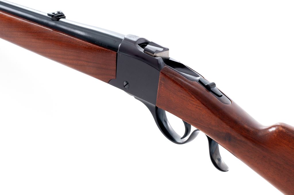 1st Year Production Ruger No. 3 Single Shot Rifle, #130-50617, .45-70 cal., 22'' barrel, blue finish, smooth straight grip walnut stock and forend, factory buttplate, folding rear sight, and fixed front sight with brass bead. Mfg'd 1973. Metal rates excellent with approx. 99% factory blue finish; receiver with normal light plum-colored toning. Wood is near excellent with a few shallow handling marks and light high edgewear to the buttstock and wrist. Action is crisp with an excellent bore. Est.: $500-$700. (Modern)
