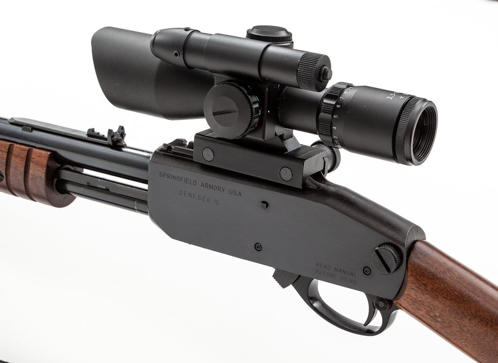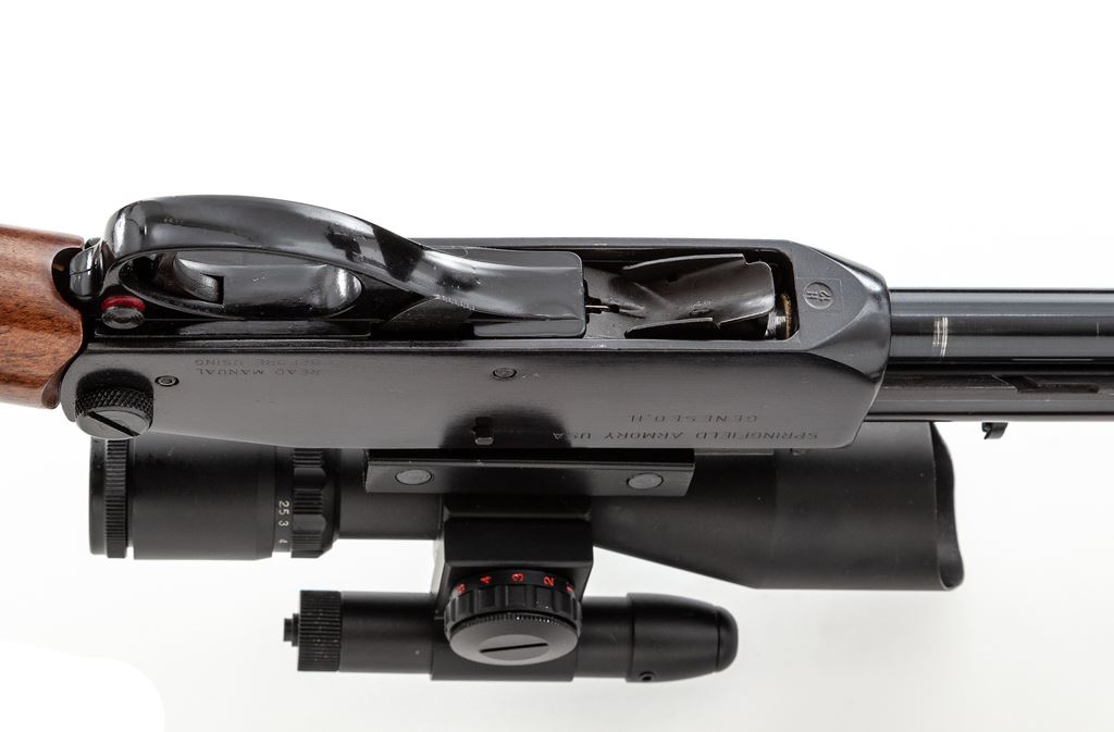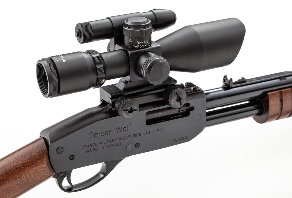 Israel Military Industries (I.M.I.) Timber Wolf Slide-Action Takedown Rifle, #TW14390, .44 mag. cal., 18.5'' barrel, blue finish, straight grip wood stock and grooved forend, black rubber recoil pad, quick-release sling swivels, white dovetailed blade front sight, with sporting elevator rear sight. Receiver with an integral scope mount and topped with a 2.5-10x40 scope with green laser and mil-dot reticle. (Scope is similar to an Osprey but does not identify the manufacturer.) Scope base is not long enough to lock into both of the slots on the integral rail. Approx. 99%+ original blue finish remains and rifle rates as excellent overall. Magazine tube shows a few very minor spots of finish loss. Wood with only a few minor handling marks. Action is crisp with a bright bore. Scope appears like new with bright clear optics; green laser was tested and functions properly. Overall a really high condition rifle that has seen little handling or use. Rare in this caliber as only 1,000 of the .44 magnum rifles were imported by Springfield Armory; this rifle is marked Springfield Armory on the left side of the receiver. Est.: $900-$1,200. (Modern)