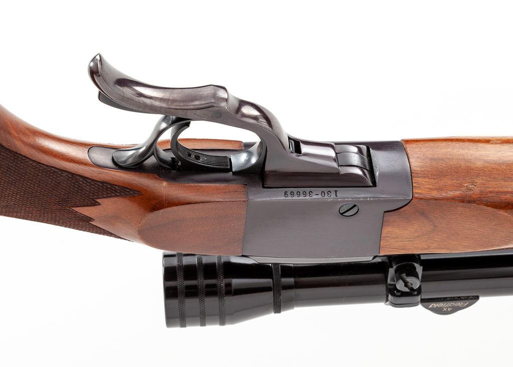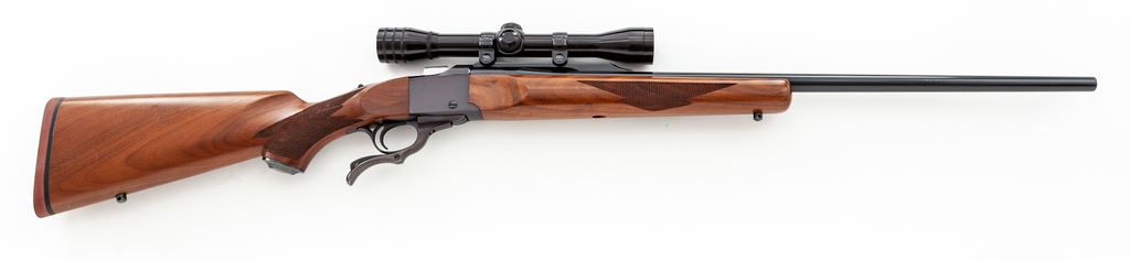 Mid-70's Ruger No. 1-B Single Shot Rifle, #130-36669, .270 cal., 26'' barrel with quarter rib, blue finish, from the factory without sights. Checkered pistol-grip walnut stock with a semi-beavertail forearm, factory red rubber pad, Ruger grip cap, and sling swivel studs. Topped with a Redfield 4x scope with a duplex reticle. Mfg'd 1976. Left side of barrel is marked ''Made In The 200th Year Of American Liberty''. Rifle is in near fine overall condition and shows signs of moderate field/range use. Approx. 97% original blue finish remains; left side of receiver with some faint scratching and lower edge with scattered specks of pitting. Receiver with normal plum-colored toning. Left side of buttstock with a few small spots of wear near the red pad; forend with scattered light to moderate shallow impressions, with one slightly more noticeable 1/4''x1/4'' shallow mar to the lower edge near receiver; checkering on both is mostly clean and sharp. Action is crisp; bright bore rates excellent. Scope exterior shows old ring marks; optics are bright and clear. Est.: $500-$700. (Modern)