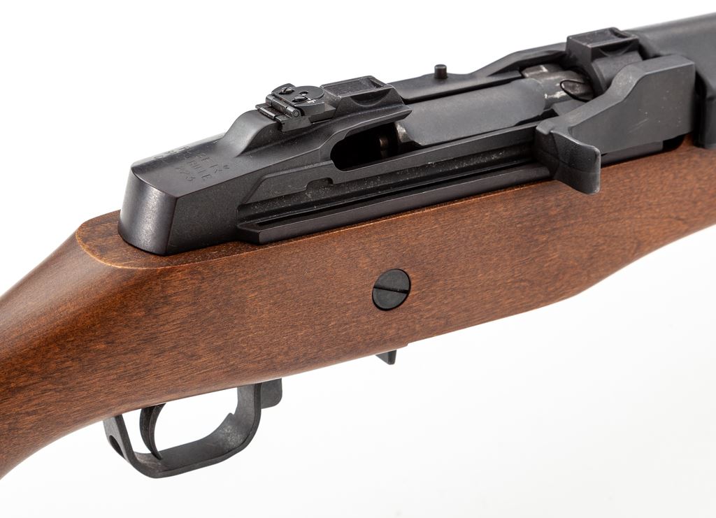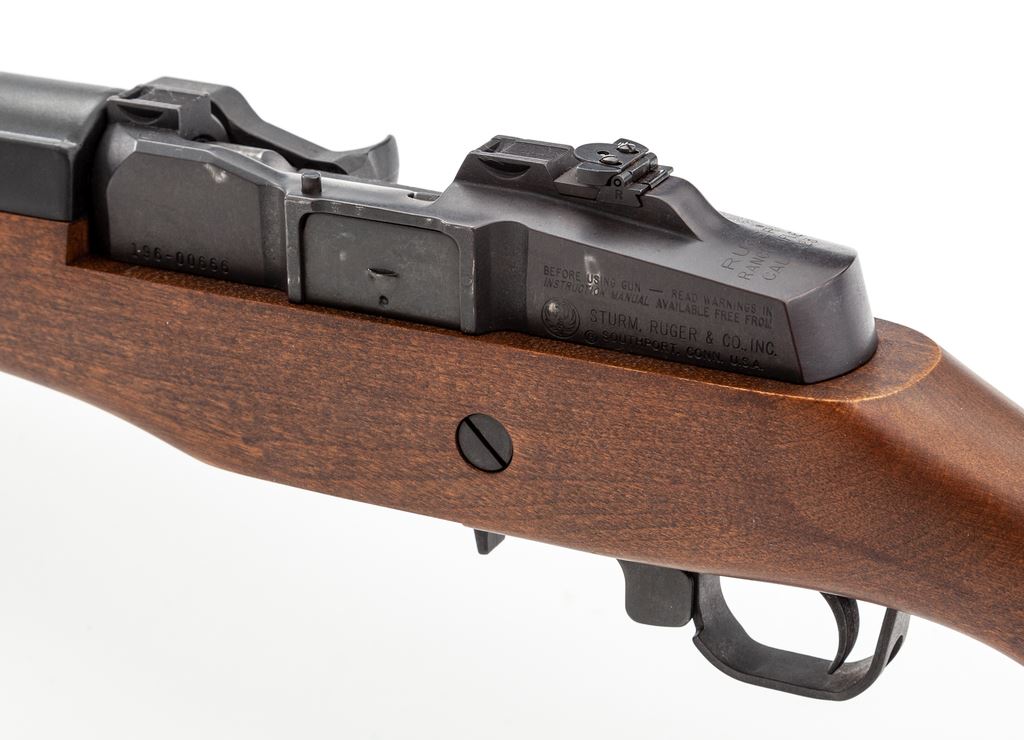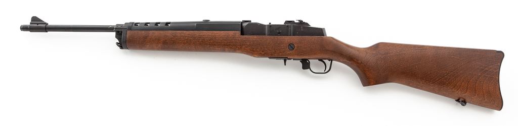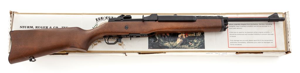 Ruger Mini-14 Ranch Rifle, #196-00666, .223 cal., 18.5'' barrel, satin blue finish, pistol-grip birch stock, factory buttplate, black upper handguard, fixed front sight, and folding rear sight, with sling swivels, and one factory 5-round magazine. In original box with matching end label, owner's manual, cable lock, and factory scope rings. Condition is excellent, showing only slight handling and rub marks, with and excellent crisp action and bright bore. Box shows storage wear and the corners on one of the end pieces are taped together. Scope rings are still sealed in the original packaging. Est.: $500-$700. (Modern)
