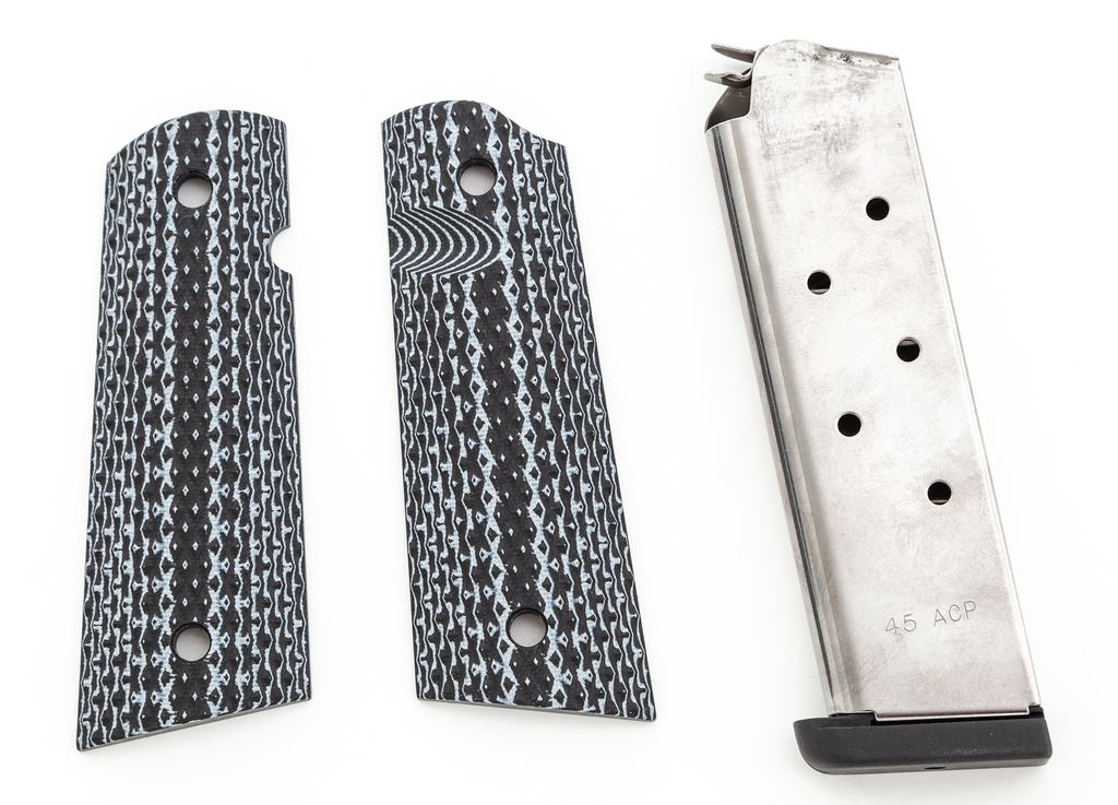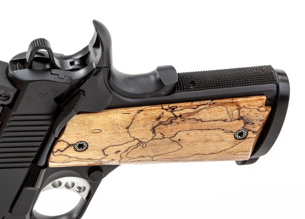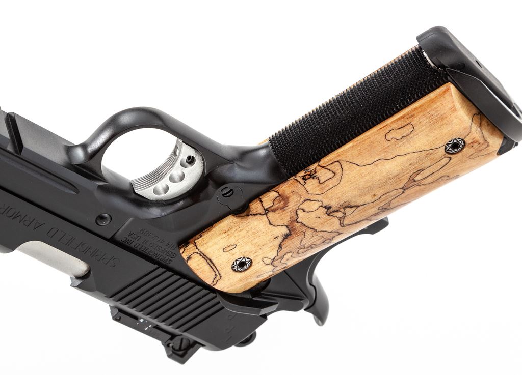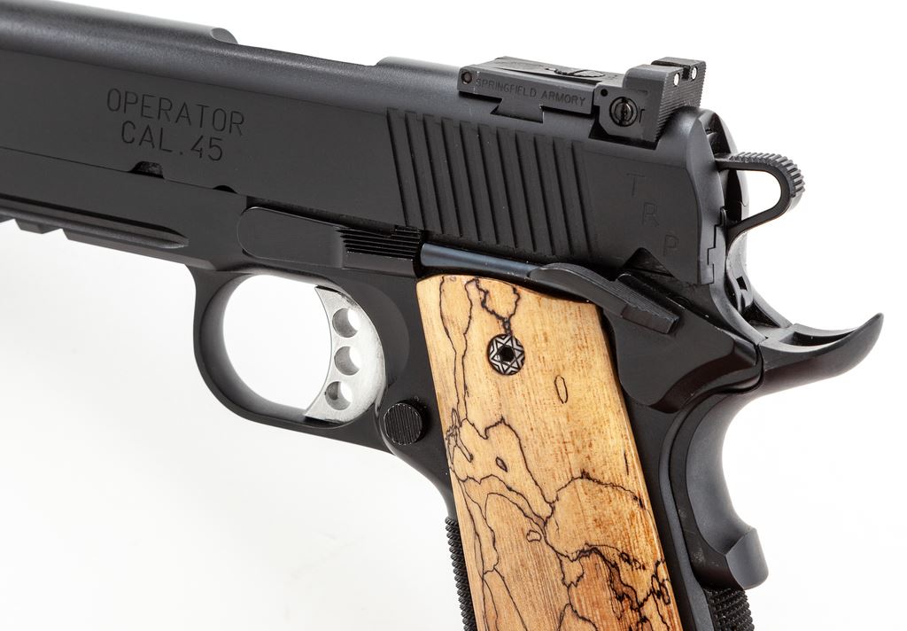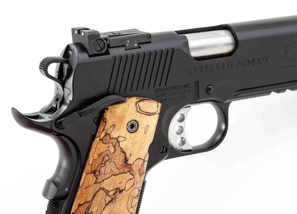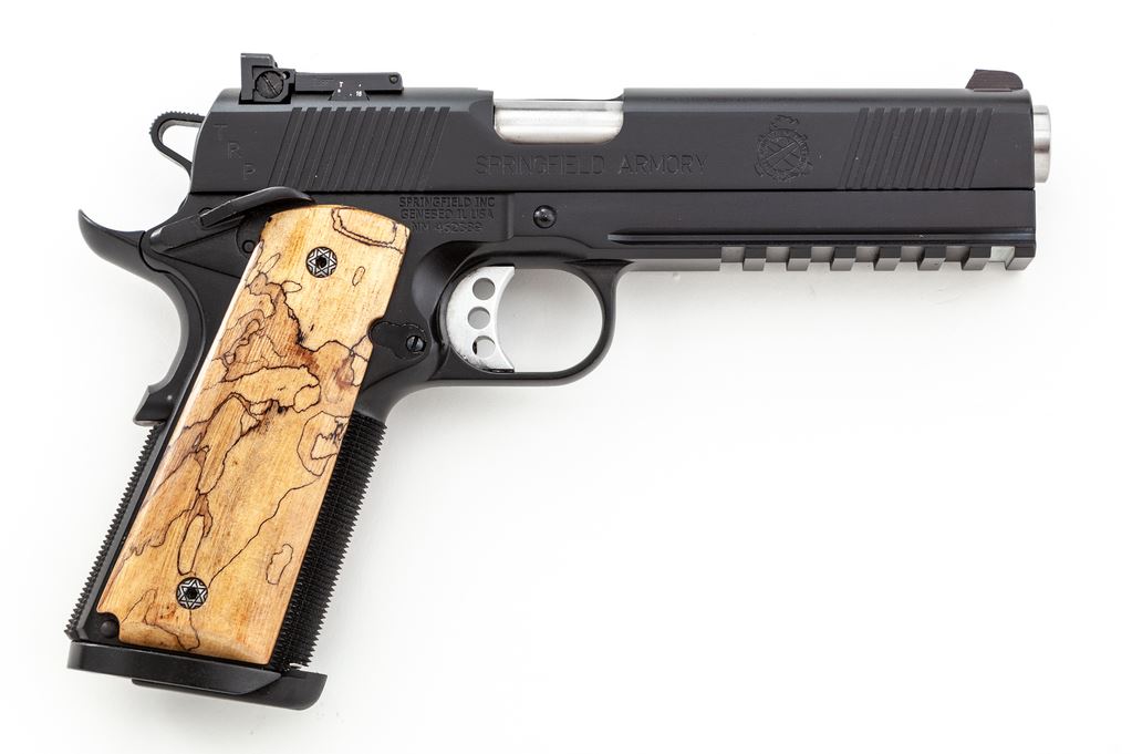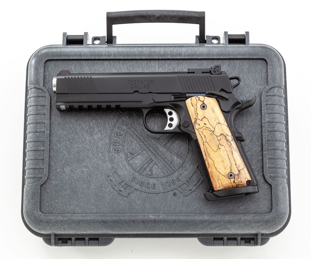 Springfield Armory 1911-A1 TRP Operator Semi-Automatic Pistol, #NM462389, .45 ACP cal., 5'' barrel, black finish, lower accessory rail, 3-dot night sights which include an adjustable rear sight, skeletonized hammer and trigger, ambidextrous thumb safety, and a pair of aftermarket exotic grips by Esmeralda O'Sheehan; grips appear to be made of Andean Alder, with decorative grip screws. Also included are the original G10 grips and two (2) magazines. In original gray plastic case that is numbered to the gun, with owner's manual and other misc. factory paperwork. Condition is excellent with approx. 99% original black finish. Left grip with a few shallow handling marks; right grip shows no visible wear. Action is smooth with an excellent bore. Original grips appear as new. Est.: $900-$1,400. (Modern/PPT)