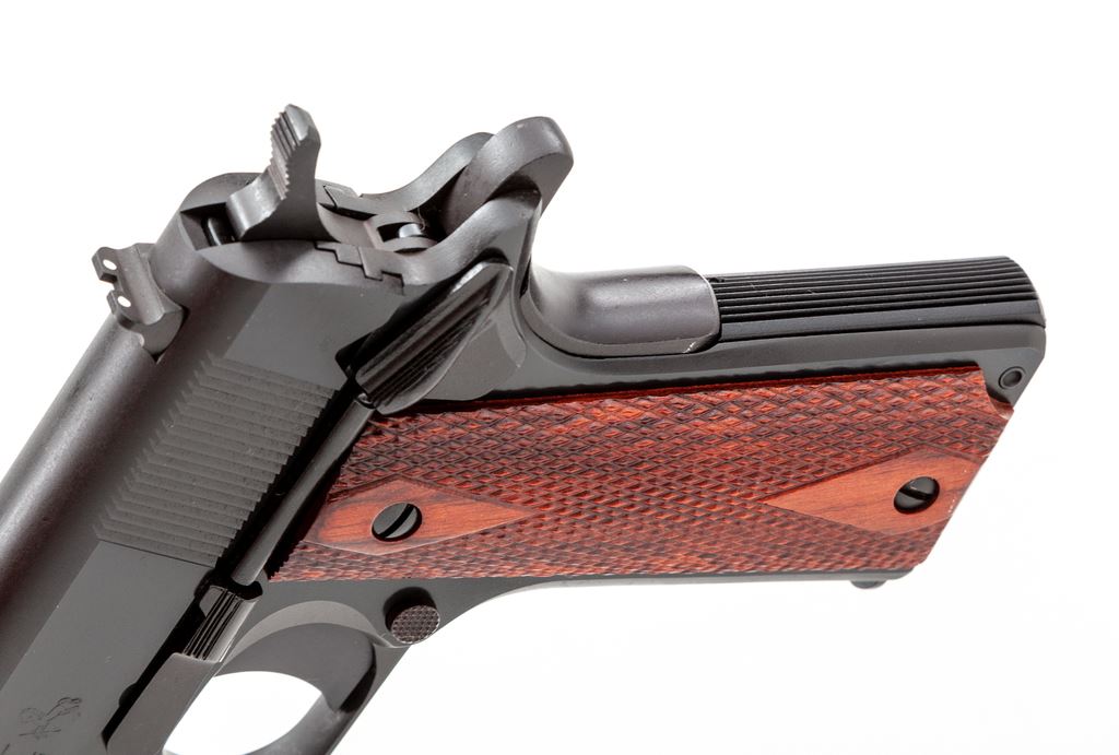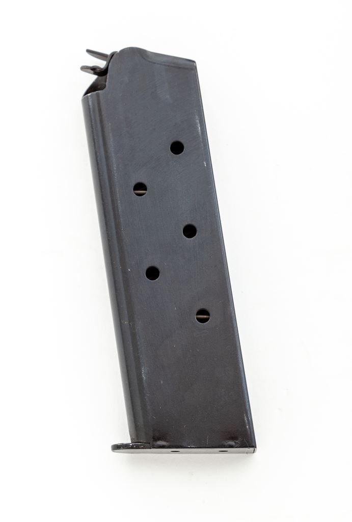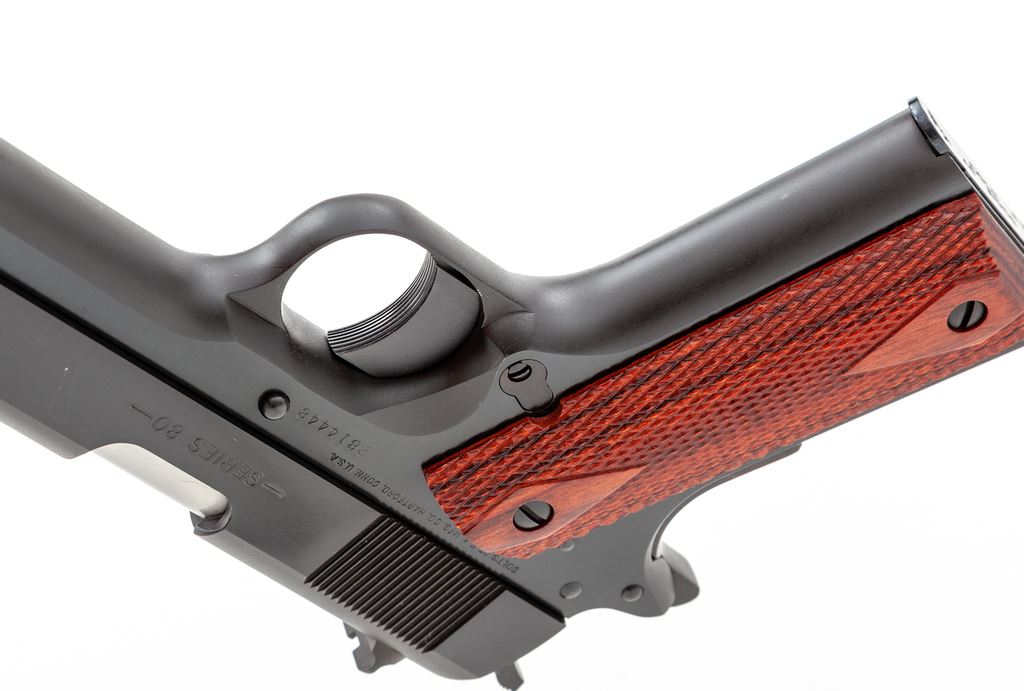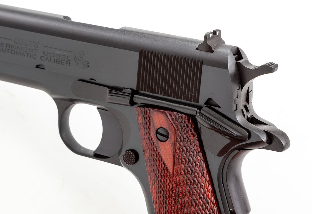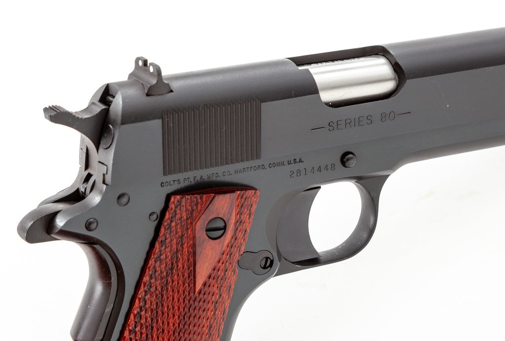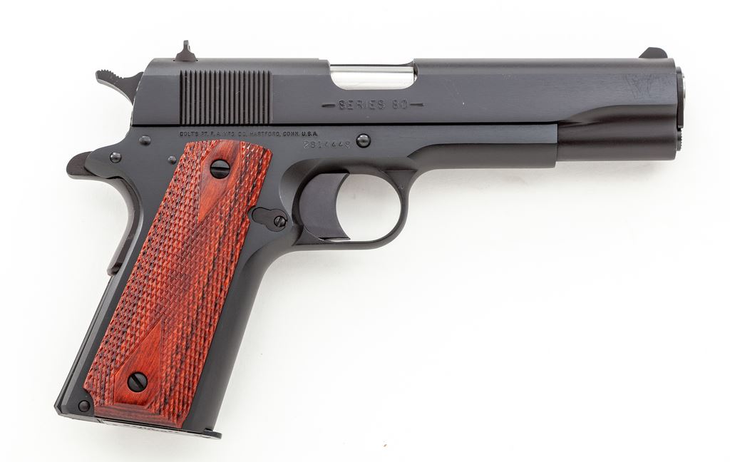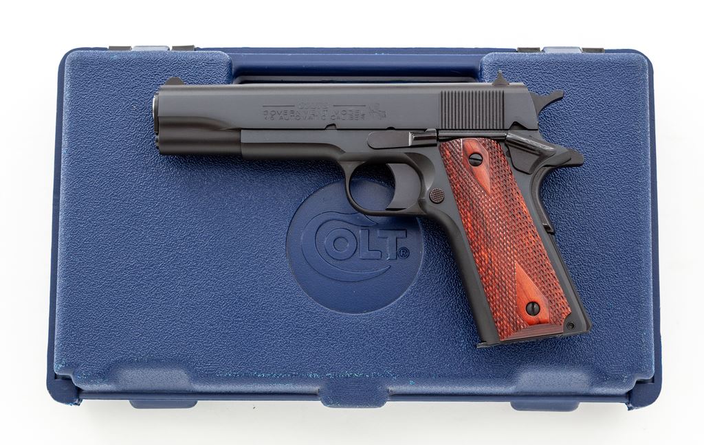 Like New Colt Series 80 Government Model Semi-Automatic Pistol, #2814448, .45 ACP cal., 5'' barrel, blue finish, checkered double diamond laminate wood grips, white 3-dot sights, one factory Colt magazine and one additional unmarked magazine. In blue plastic Colt case with owner's manual and other misc. factory paperwork. Mfg'd 2005. Pistol is in excellent overall condition. Top of slide with a light rub mark that is most likely from contact with the inside of the case, otherwise appearing as new and possibly unfired. Grips with clean sharp checkering. Factory lettering is sharp. Action is smooth with an excellent bore. Est.: $650-$950. (Modern) (Not available to Calif. residents.)