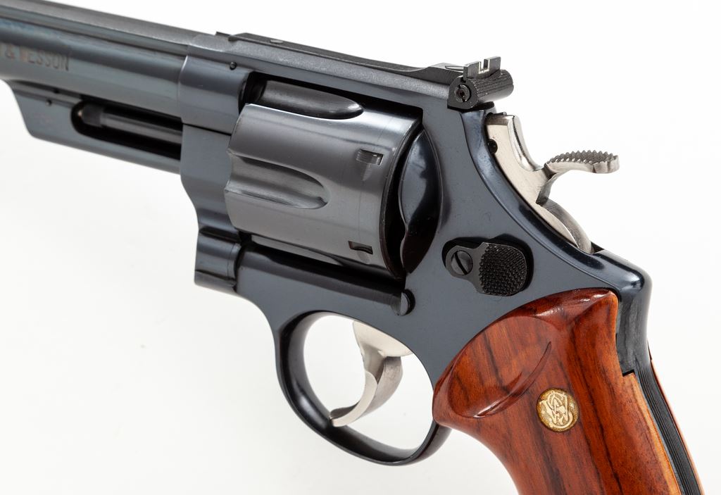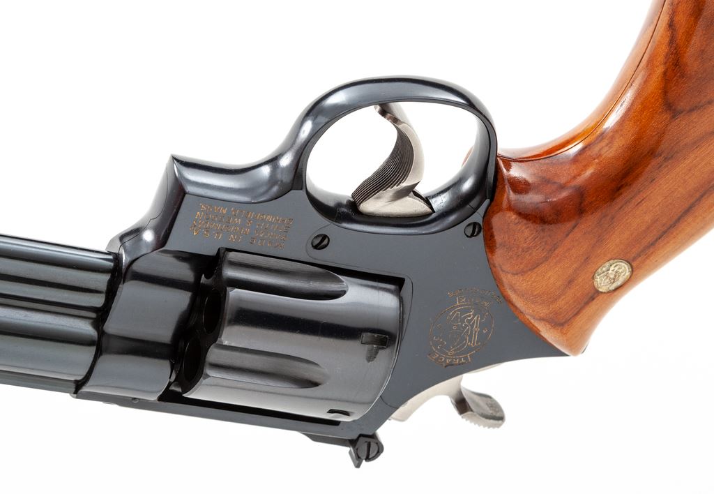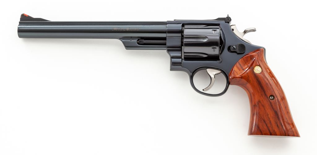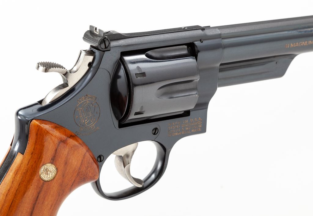 Smith & Wesson Model 57 Double Action Revolver, #N145468, .41 mag. cal., 8-3/8'' pinned barrel, blue finish, hammer and trigger have been polished bright, smooth square butt wood target grips with S&W medallions, red ramp front sight and micrometer click adjustable rear sight. All of the factory lettering has been highlighted in gold. Mfg'd 1973. Approx. 99% original blue finish remains and metal rates as excellent overall, with some scattered micro-scratching and a light index line to the cylinder. Factory lettering is clear; gold infill on the left side of the barrel is a little faded. Grips with an added coat of varnish; back edges and right grip itself are a little lighter in color from being on display in the casino, otherwise both show only normal small handling marks. Action is crisp with a smooth hammer and trigger; bright bore is excellent. Est.: $600-$900. (Modern)(Not available to Calif. residents.)(Sierra Sid's Casino, Sparks, NV.)
