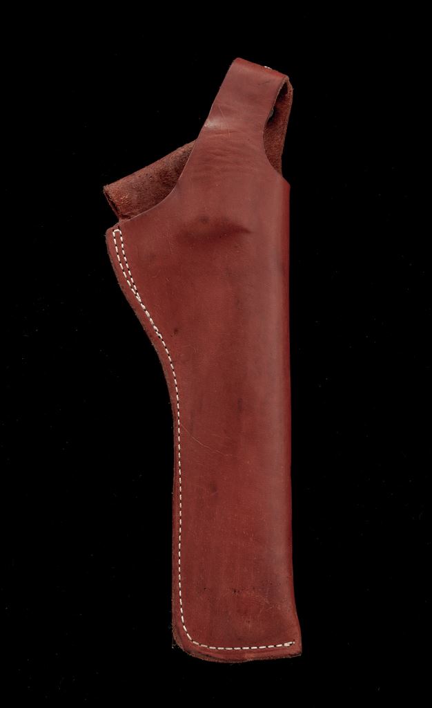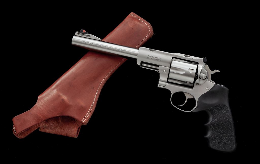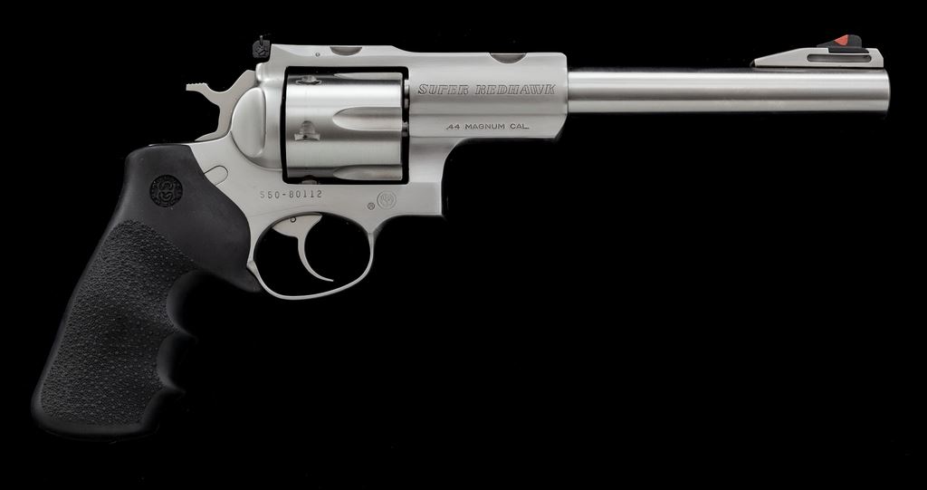 Ruger Super Redhawk Double Action Revolver, with holster, #550-80112, .44 mag. cal., 7.5'' barrel, satin stainless steel, stippled and finger-grooved black rubber Hogue grips, red ramp front sight, and white outline fully adjustable rear sight; top of frame with factory scope ring notches. Included is a brown leather right-hand holster by Guide Gear. Condition is near excellent. Metal shows normal light micro-scratching and small handling marks; cylinder with a moderate index line. Grips also show only normal light handling marks. Factory lettering is sharp. Action is smooth and crisp with an excellent bright bore. Holster shows light wear. Est.: $500-$800. (Modern/PPT)