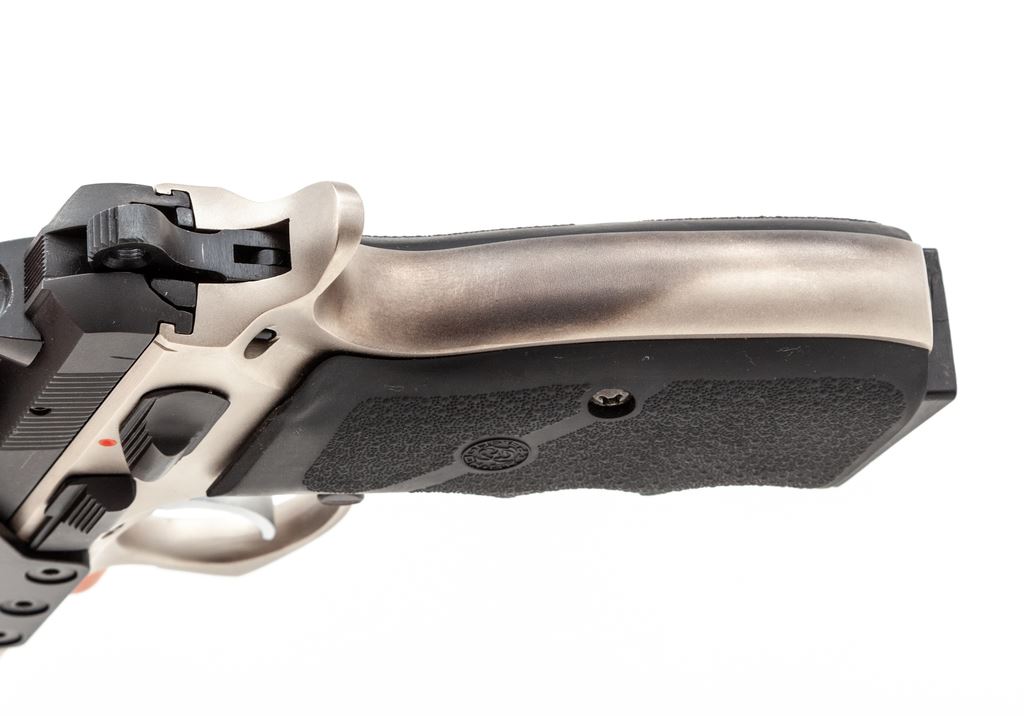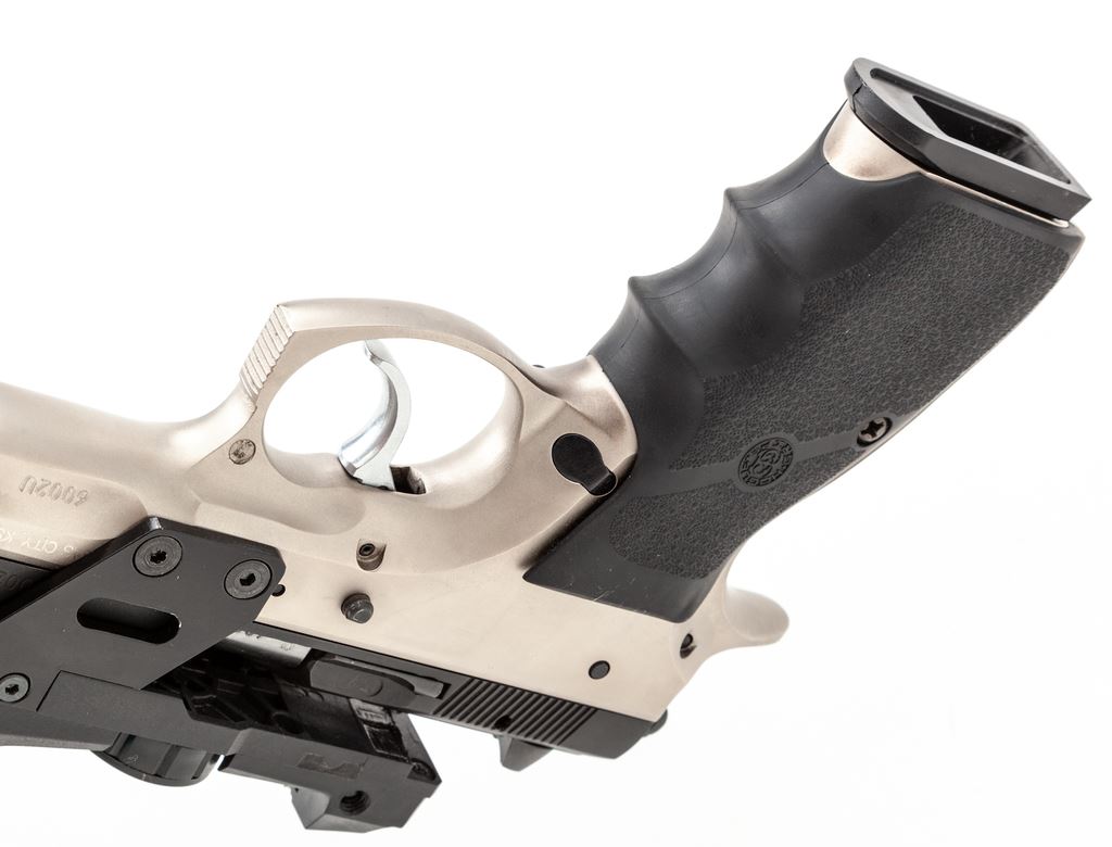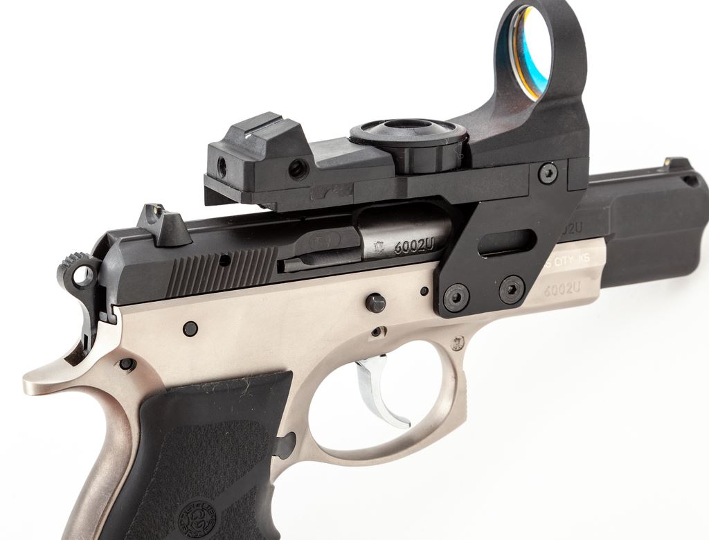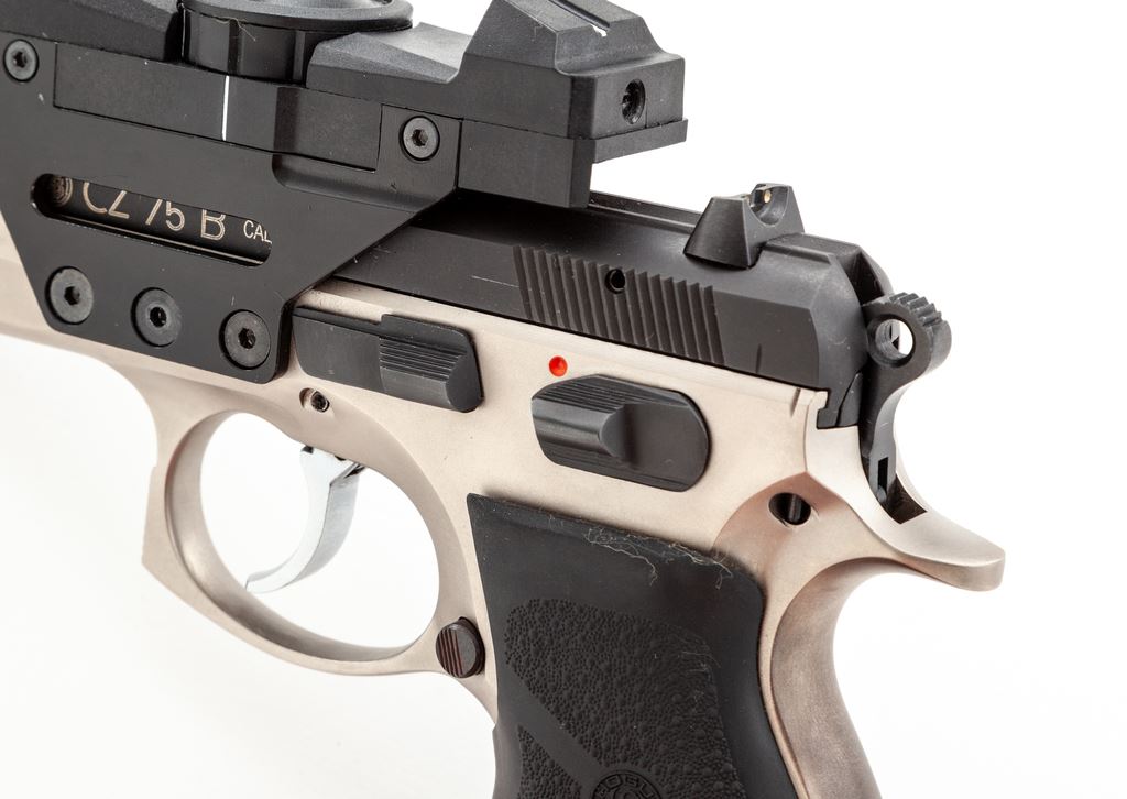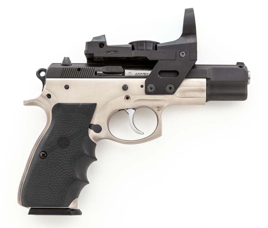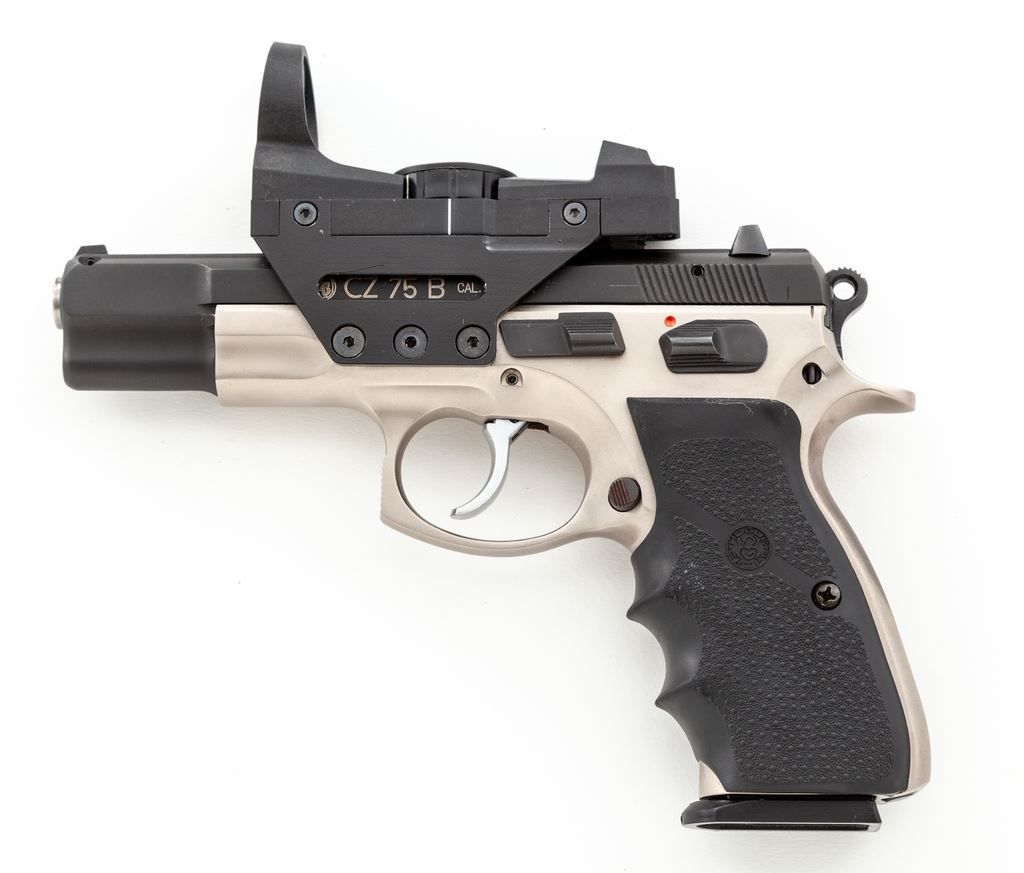 Limited CZ Model 75B Semi-Automatic Pistol, with factory installed OKO Red-Dot Sight, #6002U, double/single action, 9mm cal., 4.5'' barrel, dual tone satin blue and stainless finish, replacement wraparound finger-grooved Hogue grips, with white 3-dot sights, and one 10-round magazine. With frame-mounted OKO red-dot sight which we believe was available for a limited time as a factory installed item and was mfg'd as factory model #AB610DB. Condition is near excellent showing scattered slight handling marks and signs of range use. The most noticeable sign of wear being spots of thinning and darkening to the matte stainless finish on the backstrap. Grips show only normal light handling marks. Action is nice and smooth with a mirror bright bore. The laser was tested and functions properly. Est.: $500-$750. (Modern) (Not available to Calif. residents.)
