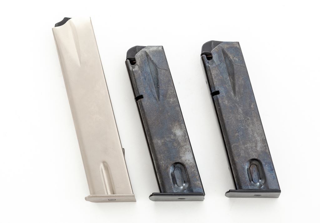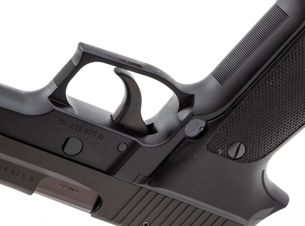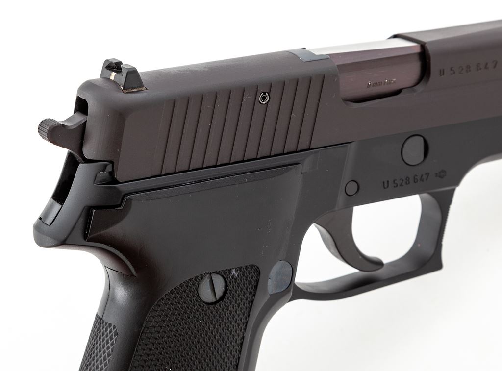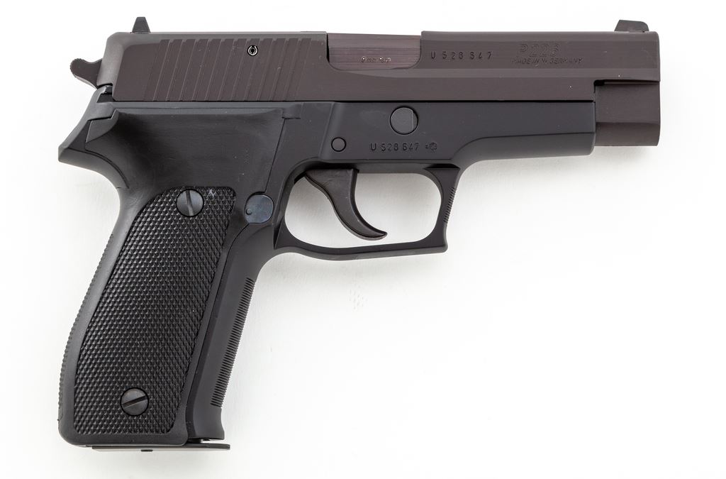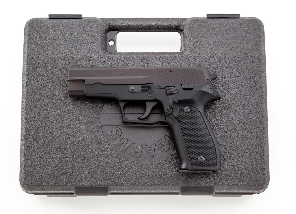 Like New Sig Sauer P226 Semi-Automatic Pistol, #U528647, 9mm cal., double/single action, 4.4'' barrel, black slide, black alloy frame, checkered black plastic grips, fixed white-dot front sight and fixed rear sight with white post, and four (4) total magazines; one factory 15-round, two (2) aftermarket 15-round, and one matte stainless aftermarket magazine that looks like 20-round capacity. In black plastic Sigarms case, plain cardboard exterior box with matching end label, and the owner's manual. Pistol is in excellent as new overall condition showing few signs of potentially being fired. Made in West Germany. Est.: $700-$900. (Modern/PPT) (High-cap mags not available to Calif. residents.)