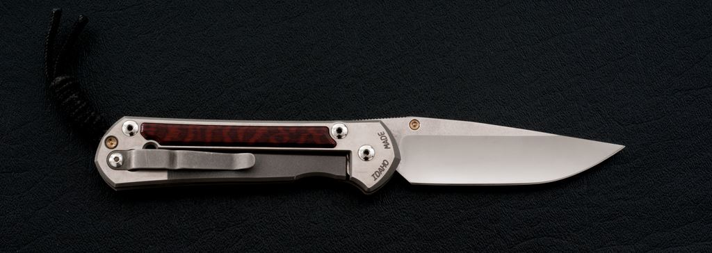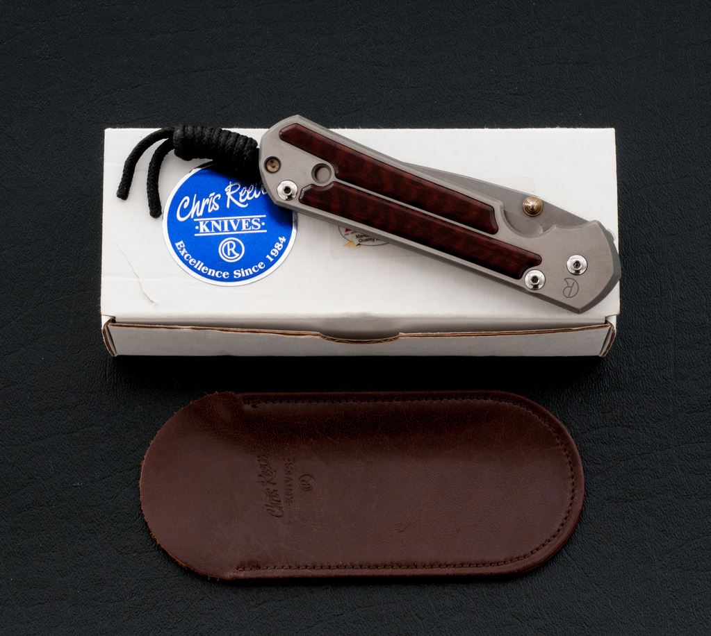 Chris Reeve Large Sebenza 21 Folding Knife, 3-5/8'' satin finished drop point blade, 4-3/4'' overall closed length, titanium frame with snakewood inlay, single thumb stud, and carry clip. Frame is marked ''Idaho Made''. In box with leather Chris Reeve pouch and cleaning cloth, instructions, and certificate noting that this knife was made in 2012. Condition is excellent. The clip and a few high points of the frame show light wear, indicating this knife may have been carried. Blade appears as new with a clean and like new cutting edge. Leather pouch is as new. Est.: $300-$450.