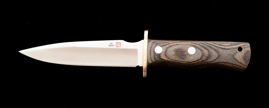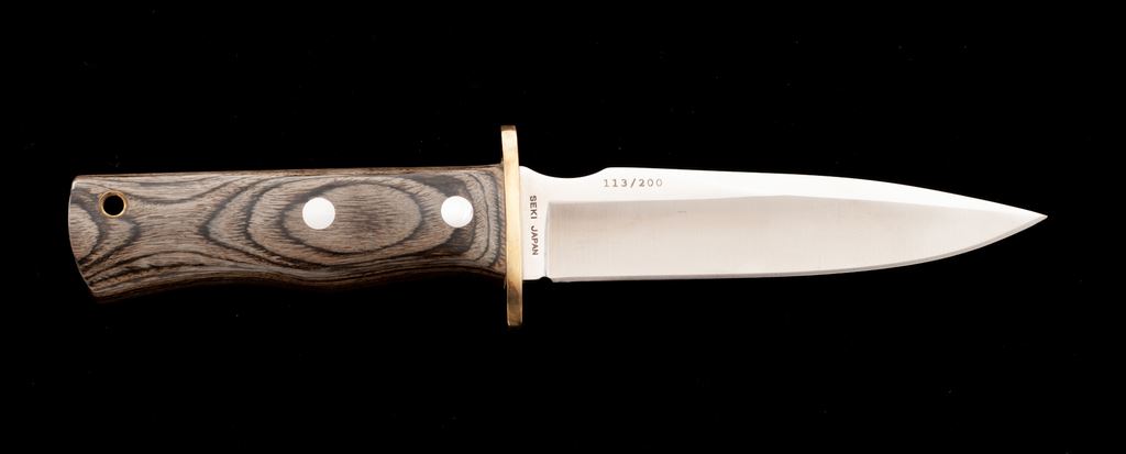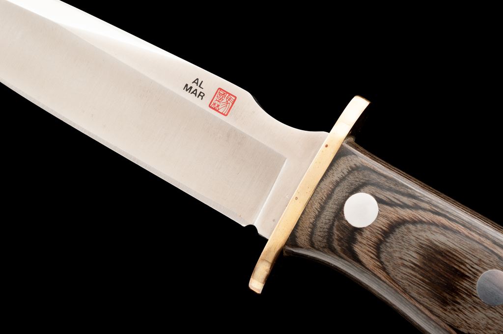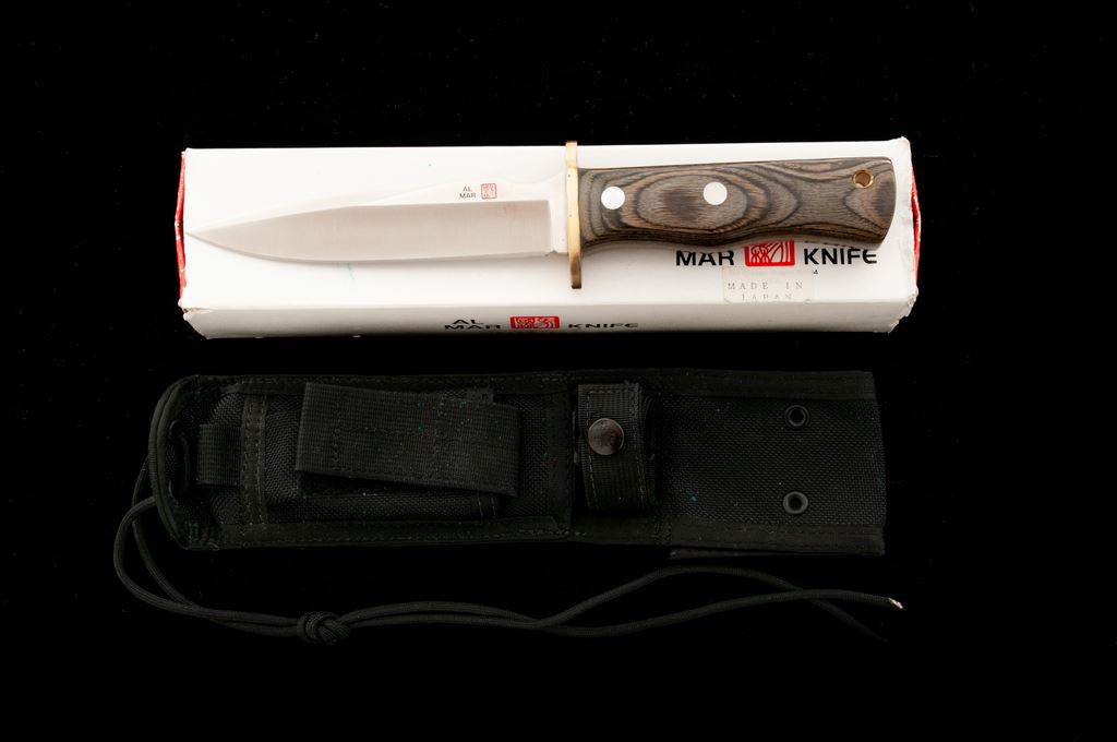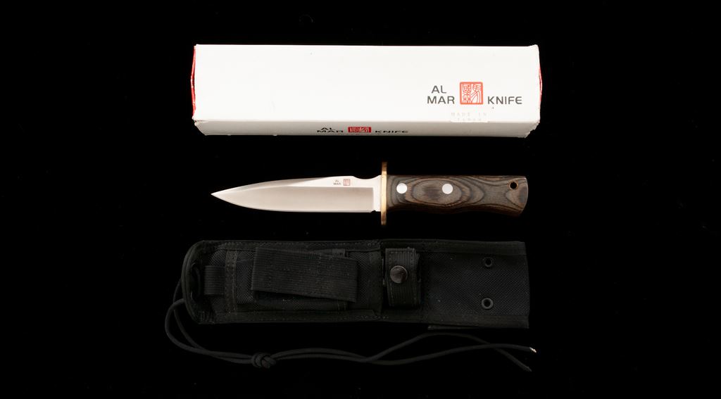 Vintage Al Mar #3101 Special Warfare I Fighting Knife, with sheath and box, #113/200, 6-1/8'' blade, 11'' overall, brass guard, laminate wood handle with brass ferrule. Includes the black nylon Cordura Eagle USA sheath, box, and small The Warrior's Edge pamphlet. Made in Seki, Japan. In excellent overall condition. Blade with a few slight surface scratches; cutting edge appears as new and is extremely sharp. Brass pieces shows normal moderate toning. Wood with a few tiny handling marks. Sheath is excellent. Box shows moderate storage wear. Est.: $300-$500.