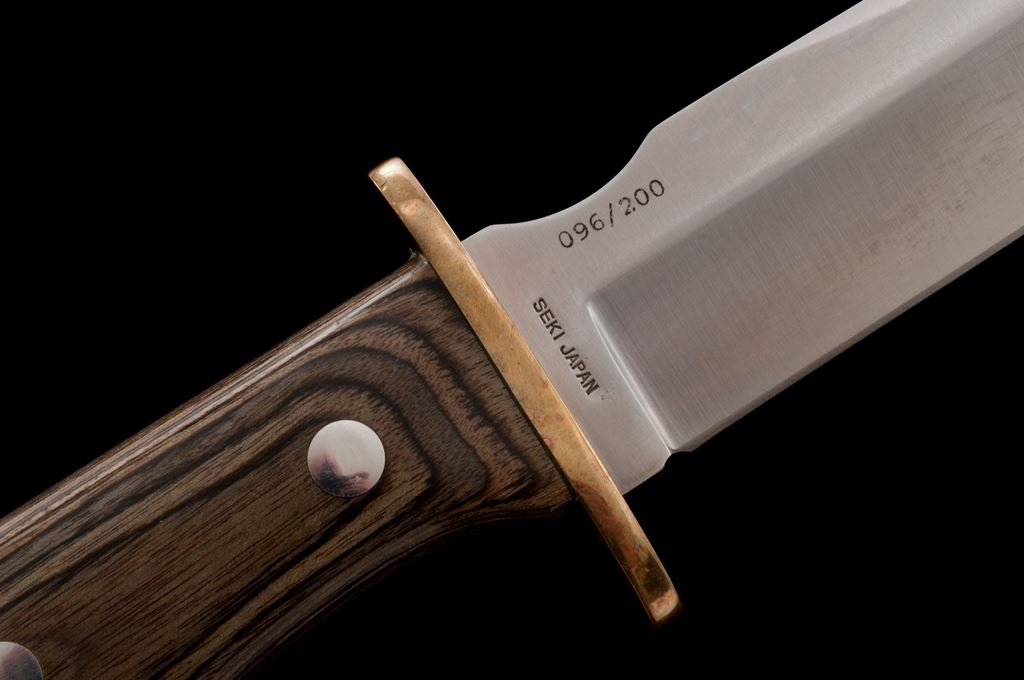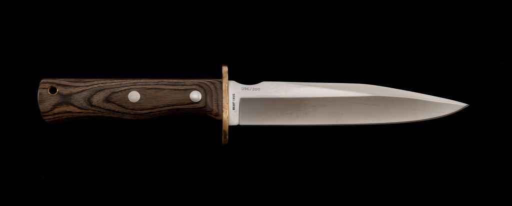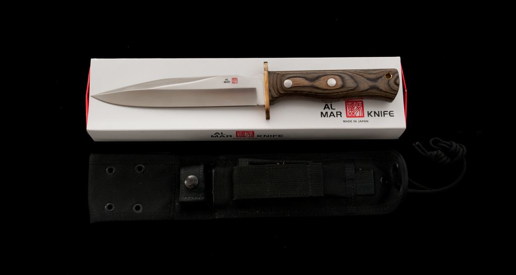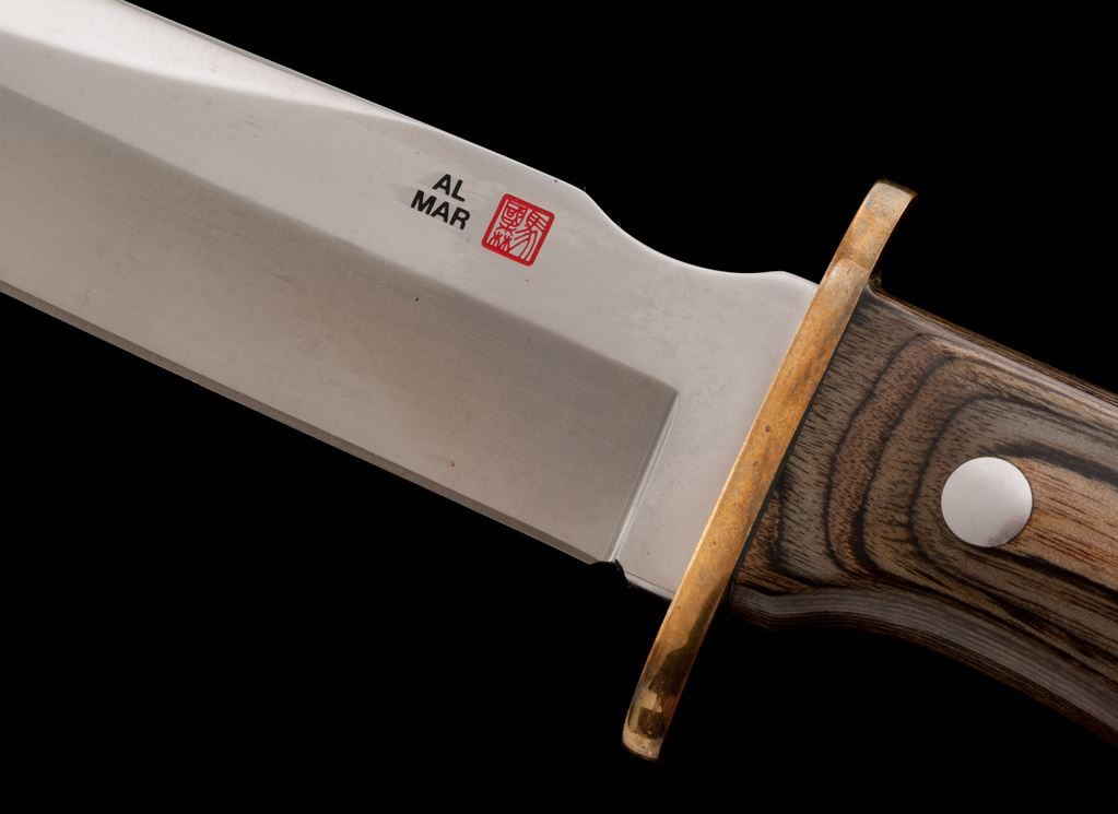 Vintage Al Mar #3102 Special Warfare II Fighting Knife, with sheath and box, #096/200, 7.5'' blade, 13-1/4'' overall, brass guard, laminate wood handle with brass ferrule. Includes the black nylon Cordura Eagle USA sheath, box, and small The Warrior's Edge pamphlet. Made in Seki, Japan. In excellent overall condition. Blade with a few slight surface scratches; cutting edge appears as new and is extremely sharp. Brass pieces shows normal moderate toning. Wood with a few tiny handling marks. Sheath and box are excellent. Est.: $300-$500.