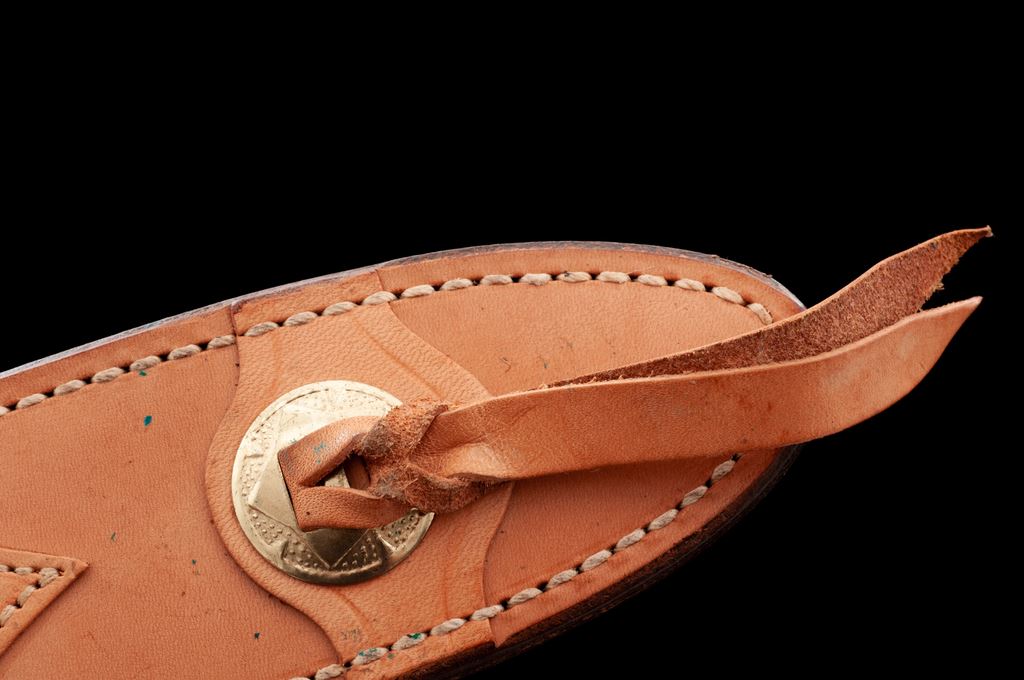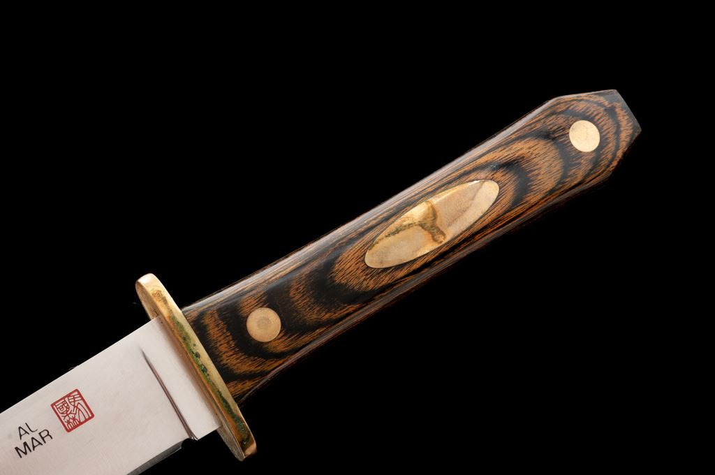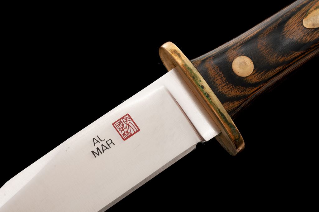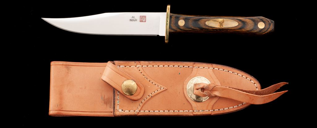 Vintage Al Mar #8507 Mini Bowie Knife, with sheath, 5'' blade, 9-1/2'' overall, brass guard, laminate wood handle, with oval brass shield inlaid into one side. In tan leather sheath that is stamped on back with ''AL MAR'' logo and ''W8507-8L''. Made in Seki, Japan. Blade is in excellent as new condition. Brass with spots of darkening and discoloration from being stored in the sheath and needs to be cleaned. Wood with only a few minor handling marks. Sheath shows some storage wear, including scattered moderate surface scuffs and spots of darkening to the light tan leather. All factory lettering and maker's marks on the knife and sheath are crisp. Est.: $250-$400.