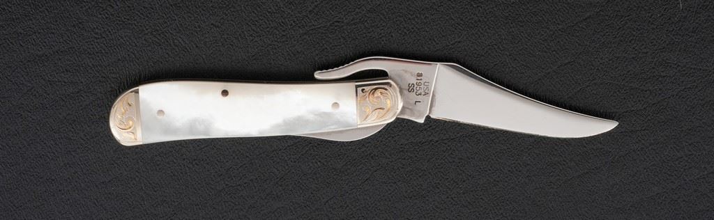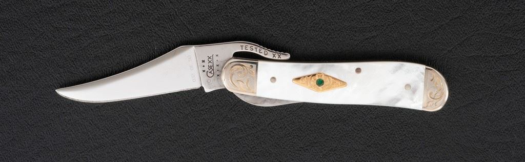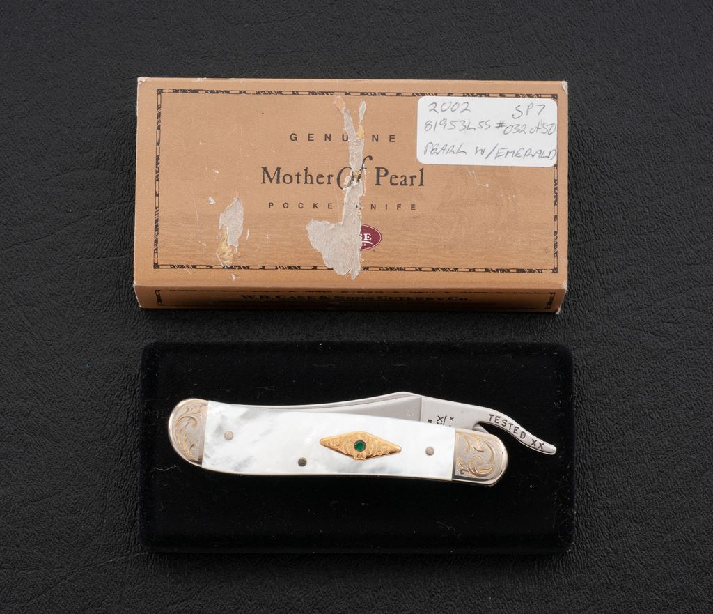 1 of Only 50 Case Knives ''Mother of Pearl'' Series Folding Knife, with Emerald. The knife is a pattern #81953L SS ''Russlock'' with engraved bolsters, 3-1/2'' overall closed length, pearl handle with a single emerald inlaid into an engraved diamond pattern shield. The blade is numbered ''32 of 50''. Mfg'd 2002. Included is the original black velvet box with cardboard slipcover and folding pamphlet. In excellent as new condition, never carried or sharpened. Blade shows a few slight handling marks. Pearl handles are free of any chips or cracks. Front side of the cardboard slip cover shows some finish loss. Est.: $300-$400.
