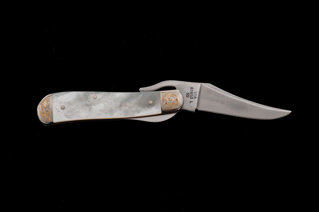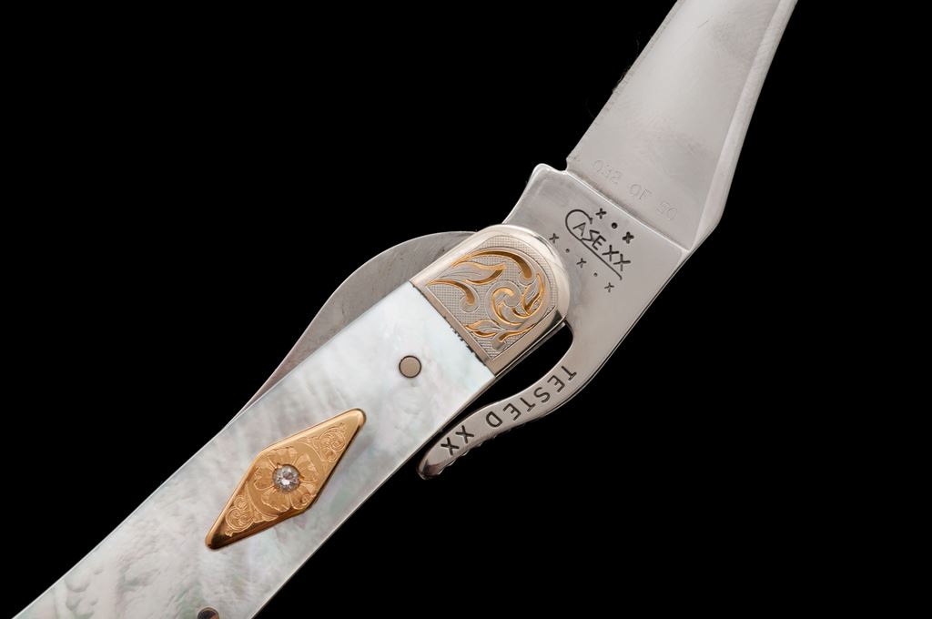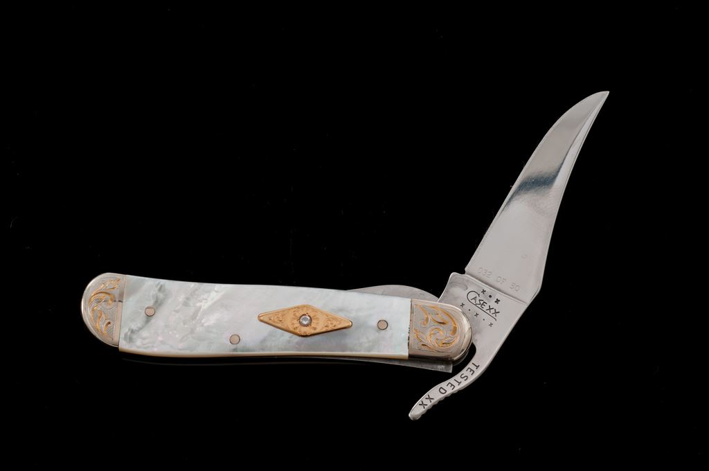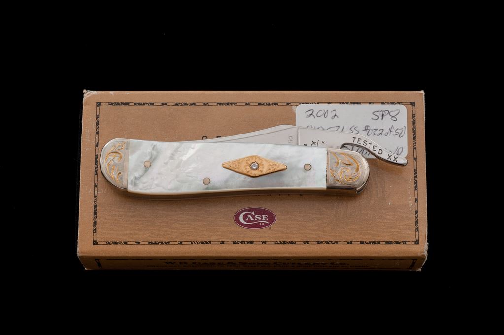 1 of Only 50 Case Knives ''Mother of Pearl'' Series Folding Knife, with Diamond. The knife is a pattern #81953L SS ''Russlock'' with engraved bolsters, 3-1/2'' overall closed length, pearl handle with a single diamond inlaid into an engraved diamond pattern shield. The blade is numbered ''32 of 50''. Mfg'd 2002. Included is the original black velvet box with cardboard slipcover and folding pamphlet. In excellent as new condition, never carried or sharpened. Blade shows a few slight handling marks. Pearl handles are free of any chips or cracks. Est.: $300-$400.