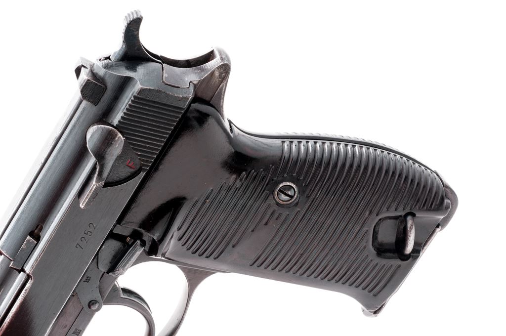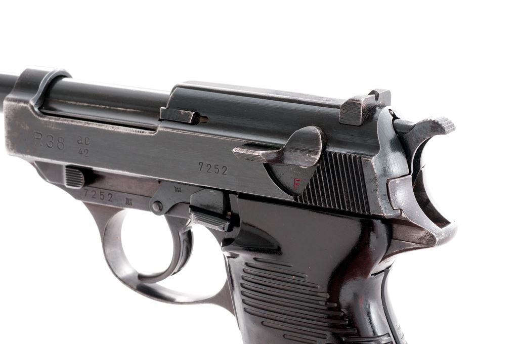 WWII Era Walther P.38 (ac/42) Semi-Automatic Pistol, #7252, 9mm, 4.75'' barrel, blue finish, brown grooved phenolic resin grips, with one mismatched ''jvd'' P.38 magazine. Condition is fine retaining approx. 85% original blue. Grips with light even wear. All visible matching numbers including locking block. Action is crisp, bore is bright. Est.: $750-$1,000. (C&R/PPT)