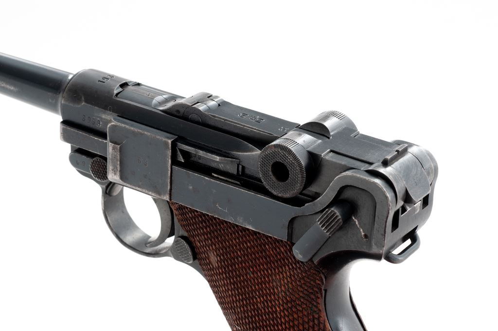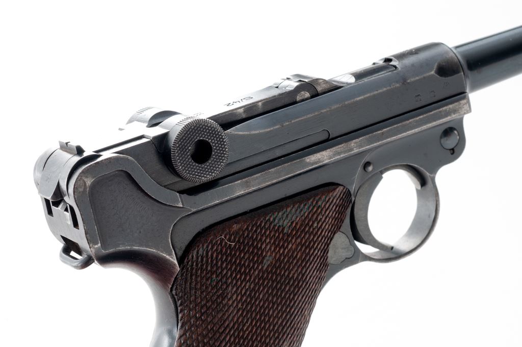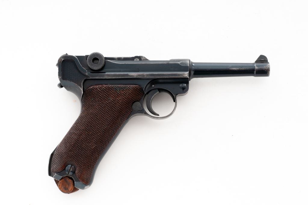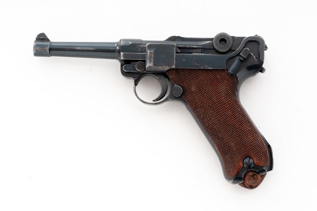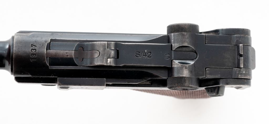Pre-WWII German P.08 Luger, by Mauser (S/42), #8969u, 9mm, 4'' barrel, blue finish, factory checkered walnut grips, with one WWI era nickel-plated magazine with unmarked wooden base. Chamber area dated 1937, toggle marked ''S/42''. Condition is very good with all visible matching numbers, retaining approx. 85% overall thinning blue. Grips with moderate flattening. Good action, magazine does not consistently hold the action open, bright bore. Est.: $800-$1,200. (C&R/PPT)