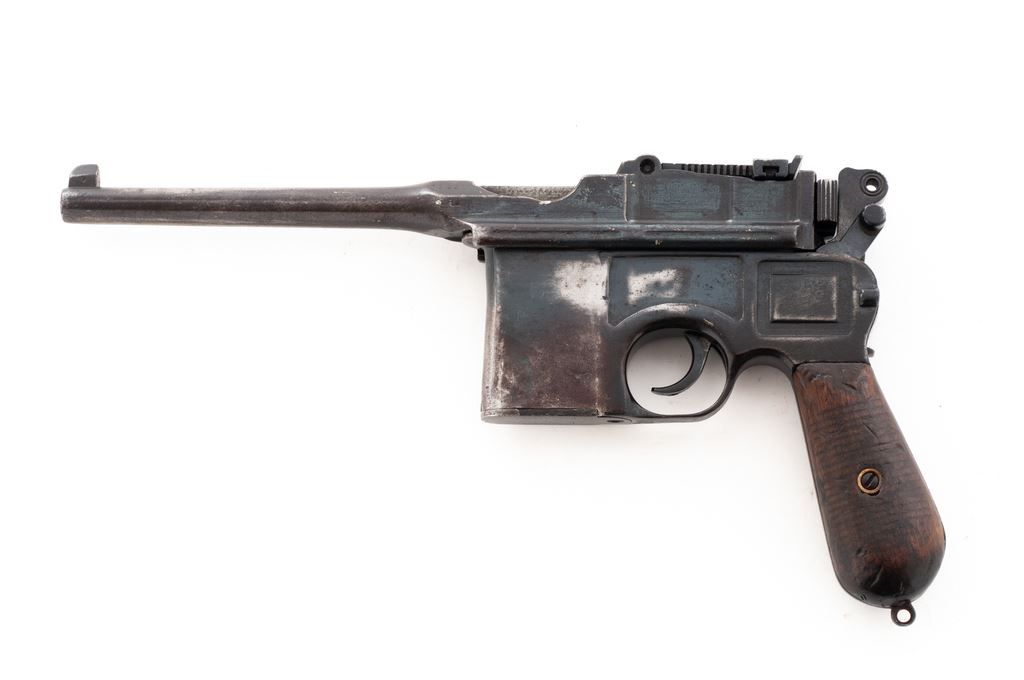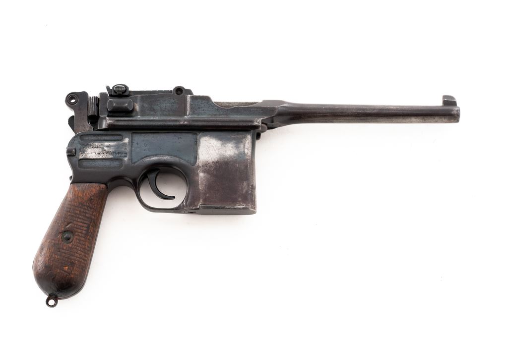 Mauser C96 Broomhandle Semi-Automatic Pistol, #524067, .30 Mauser cal., 5.5'' barrel, blue finish, walnut grip. Condition is fair to good as 1980s imported from China. Approx. 70% later accomplished blue. Grips with heavy wear. Good action, dark bore. Est.: $300-$500. (C&R/PPT)
