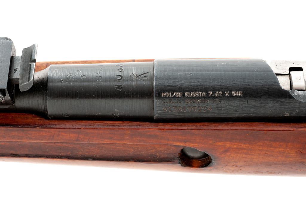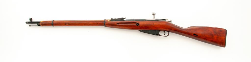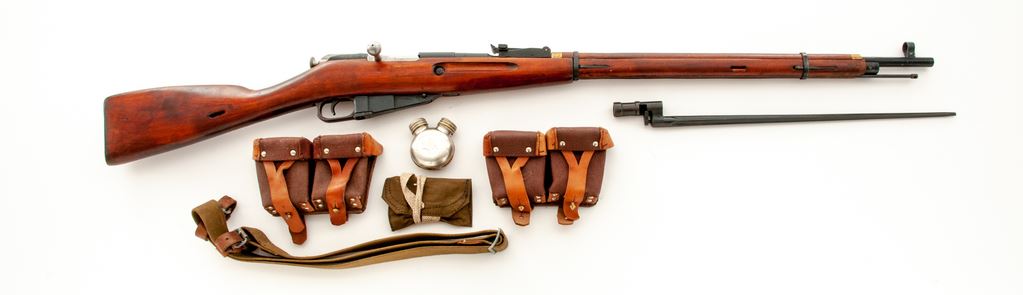 Soviet Izhevsk Arsenal M91/30 Mosin-Nagant Bolt Action Rifle, importer applied #9130199214, 7.62x54R cal., 28.75'' barrel, dark blued finish, hardwood stock, hooded post front sight, adjustable tangent rear sight, with cleaning rod. Marked on top of barrel with ''Soviet Crest'', dated ''1942'', and ''Izhevsk Arsenal'' stamp. Barrel and receiver with arsenal refurbishment stamps. Visibly numbered metal parts are matching. Left side of receiver is import marked. Includes bayonet, ammo pouch, cleaning accessories, sling, and Century Arms owner's manual. Condition overall is very good as arsenal overhauled. Approx. 95% of combination blue/black finish remains; factory lettering is mostly clear. Forend and handguard with some moderate thinning to the finish, otherwise stock with a mostly even color, normal scattered shallow handling marks and surface dents. Action is smooth; bore is lightly frosted with very good+ rifling. Est.: $200-$350. (C&R)