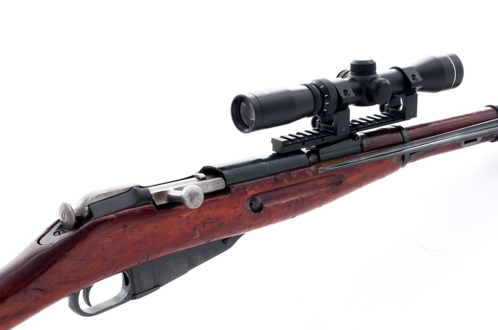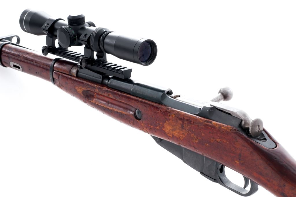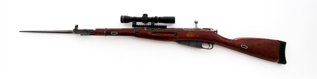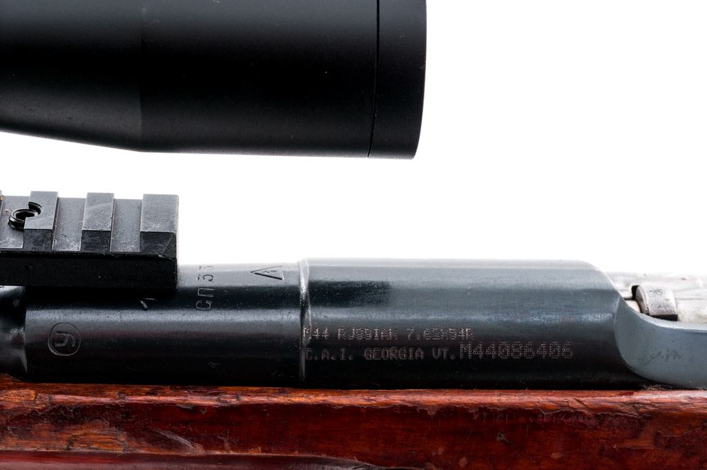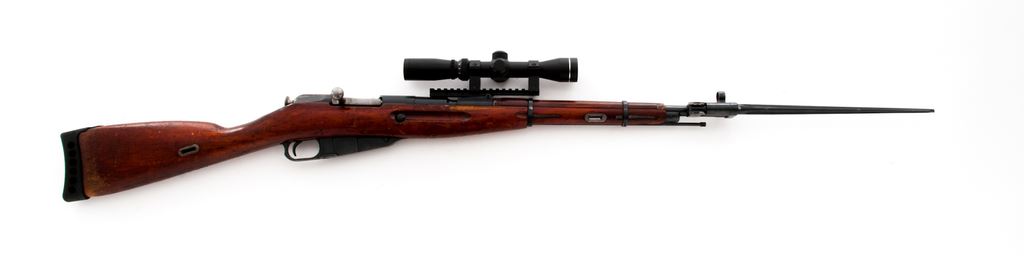 Soviet Izhevsk M44 Mosin-Nagant Bolt Action Carbine, with side folding bayonet and scope, importer applied #M44086406, 7.62x54R cal., 20.5'' barrel, blued finish, wood stock, hooded post front sight with cleaning rod, and black rubber recoil pad. Rear sight leaf has been removed and base has been used for added scope mount. Topped with a AIM 2-7x32 scope with a duplex reticle. Marked on barrel shank with Izhevsk Arsenal maker's mark; date is not visible due to the added scope mount. Triggerguard and receiver with matching numbers; bolt has been electro-penciled to match. Left side of receiver is import marked. Metal rates as very good with approx. 93% blue finish, with some scattered light freckling to the metal. Wood is good with considerable flaking to the finish as well as general surface dings and scratches. Action is smooth, bright bore with some spots of very light frosting; overall bore is fine+ with nice rifling. Bayonet operates smoothly. Scope is excellent with bright clear optics. Est.: $150-$250. (C&R)