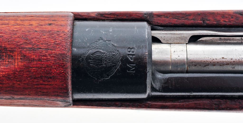 Yugoslavian M48 Mauser Bolt Action Rifle, #M11796, 8x57mm cal., 23.25'' barrel, blued finish with bright bolt, and hardwood stock. Inverted ''V'' front sight with protector and adjustable tangent rear sight. Marked on receiver ring with Yugoslavian crest over ''M48'', and on left side ''HPJ''. Left side receiver rail is marked in Cyrillic ''NPEAY3EKE 44''. Matching numbers on bolt handle, serial numbers on stock and floorplate have been renumbered to match. Buttplate is originally from a German WWII rifle and stamped with code ''bpr'' and a mismatched serial number. Cleaning rod is included. Condition overall is fine with almost all of the blued finish remaining on the metal, with the exception of the buttplate, which has been cleaned bright and shows a small area of patina. Stock shows several areas of chipping around the buttplate, otherwise the wood is very good with light handling marks. Action is smooth, bright bore is excellent. Import stamped on right side of barrel. Est.: $200-$400. (C&R)