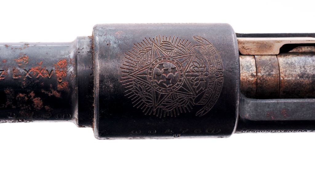 Lot of Two (2) Mauser Barreled Actions: 1.) Brazilian Model 1908/34, #0476U, in 7x57mm cal. Included is a mismatched bolt, trigger, front and rear sight. Barrel and receiver with matching numbers; receiver ring with Brazilian crest. Metal with a combination dark patina and some blue finish, with scattered light to heavy pitting. Brazilian crest is clear, no visible import marks. Bore is lightly frosted with very good rifling. 2.) Fabrique Nationale Mauser, #28260, in 8mm Mauser cal. Includes trigger, front and rear sight. Barrel and receiver with matching numbers; receiver ring with standard ''FN'' crest. Metal with some minor pitting and an overall darkening patina. Bore is dark with very good rifling. Est.: $150-$250/lot. (Both/Modern)
