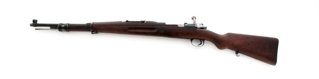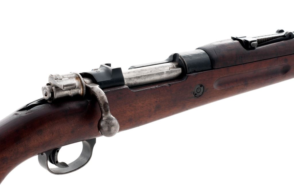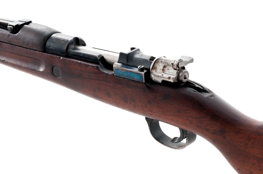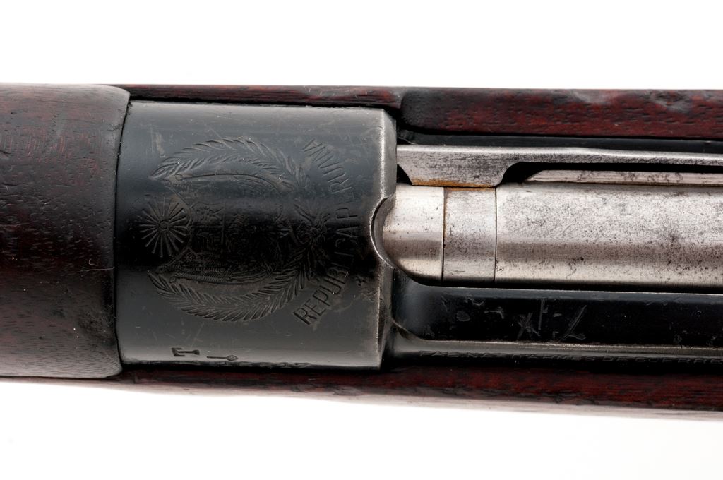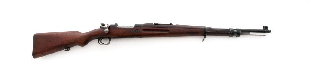 Peruvian Model 1935 Mauser Bolt Action Rifle, #16617, .30-06 cal., 23.1'' barrel, black painted finish, hardwood stock, inverted ''V'' front sight with protectors and adjustable tangent rear sight. Marked on top of receiver ring with Peruvian crest over ''REPUBLICA PERUANA'', ''Tower'' stamp on left side, and on right side with a partial ''MODELO 1935''. ''.30'' marked on top rear of receiver. Left side receiver rail is marked ''FAB.NAT.D'ARMES DE GUERRE HERSTAL-BELGIQUE''. Matching numbers. Bolt handle is knurled on flat underside. Safety lever is reversed. Sheet metal buttplate with ridges. Includes cleaning rod. Rifle has had trigger shoe installed. Condition overall is very good with approx. 75% finish remaining on metal surfaces showing overall scratches. Buttplate is unfinished with light patina. Wood is very good with an even color, light sanding scratches, and a few handling marks. Action is smooth, bright bore is excellent. No visible import stamps. Est.: $300-$400. (C&R)