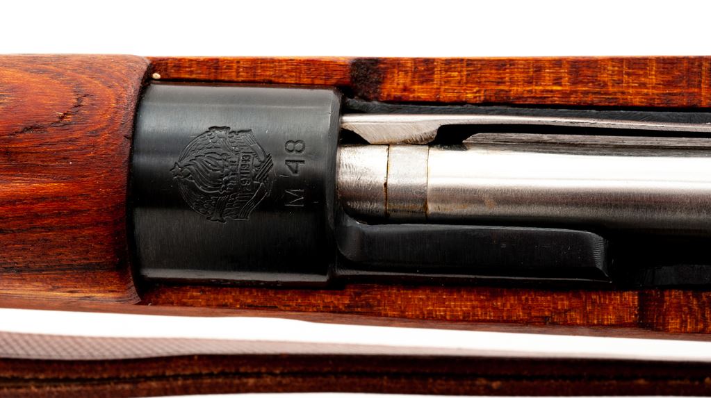 Yugoslavian M48 Mauser Bolt Action Rifle, #T98893, 8x57mm cal., 23.25'' barrel, blued/bright finish, hardwood stock, inverted ''V'' front sight with hood and adjustable tangent rear sight. Marked on receiver ring with Yugoslavian crest over ''M48'', and on left side of chamber ''HPJ''. Stamped on left side receiver rail in Cyrillic script ''NPENY3EKE 44''. Includes cleaning rod. Matching numbers with ''4807'' also stamped on underside of bolt handle. Condition overall is near excellent with almost all of the dark blue finish present on metal surfaces, with some light patina on the bright buttplate. Wood is also excellent with an even flat finish and a few light handling marks. Action is smooth, bright bore is excellent with sharp rifling. Import stamped on right side of barrel. Includes a reproduction Kar98k type leather sling in excellent condition. Est.: 250-$400. (C&R)