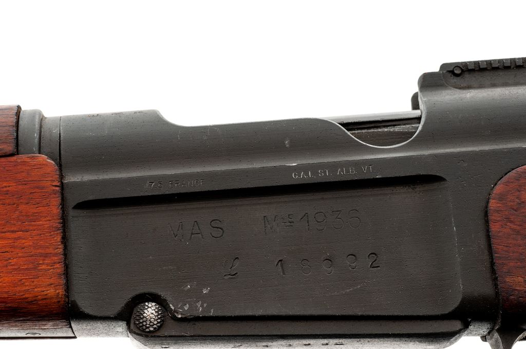 French MAS Model 1936 Bolt Action Rifle, with bayonet, #L18992, 7.5 French cal., 22.64'' barrel, parkerized finish, hardwood stock, blade front sight with hooded protector and sliding aperture rear sight. Marked on left side of receiver ''MAS MLE 1936''. Faint cartouche on right side of buttstock. Matching numbers. Condition overall is very good with over 95% finish remaining on metal surfaces, with a couple of scratches to the receiver. Magazine floorplate is jammed in the well; attempts to remove it resulted in nicks to the left side of the receiver and flattening to the knurling on the release button. Wood is very good with darkening and a few light handling marks. Action is serviceable; bright bore is excellent with sharp rifling. Import stamped on left side of receiver. Includes a French arsenal tag hung on the sling loop marked ''SEP. 1974''. Bayonet is good with old pitting on the blade covered by an arsenal refinish. Est.: $200-$400. (C&R)