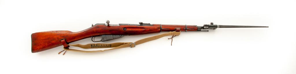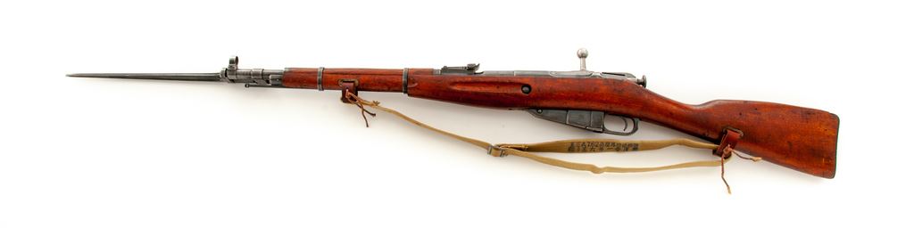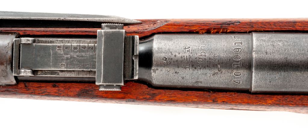 Chinese Type 53 Mosin-Nagant Bolt Action Carbine, with side folding bayonet, #4010917, 7.62x54R cal., 20.25'' barrel, blue finish, wood stock, hooded post front sight, adjustable tangent rear sight, cleaning rod, and Chinese marked canvas sling with leather collars. Stamped with Chinese characters and ''1956/26'' on barrel shank. Top edge of buttstock with a small ''(triangle)21'', ''(star)'', and other misc. stamps that are not legible. Metal with visible matching numbers; stock is unnumbered. Left side of barrel is import marked. Approx. 50%-60% thinning blue finish remains and rifle rates as very good overall. Factory lettering is mostly clear. Wood with a added coat of finish and a fairly even reddish brown in overall color, with general impressions and handling marks; both the handguard and stock are free of any cracks or major damage. Action is smooth; grooves are moderately frosted; rifling is sharp. Bayonet operates smoothly. Sling shows normal light age and wear. Est.: $150-$300. (C&R)