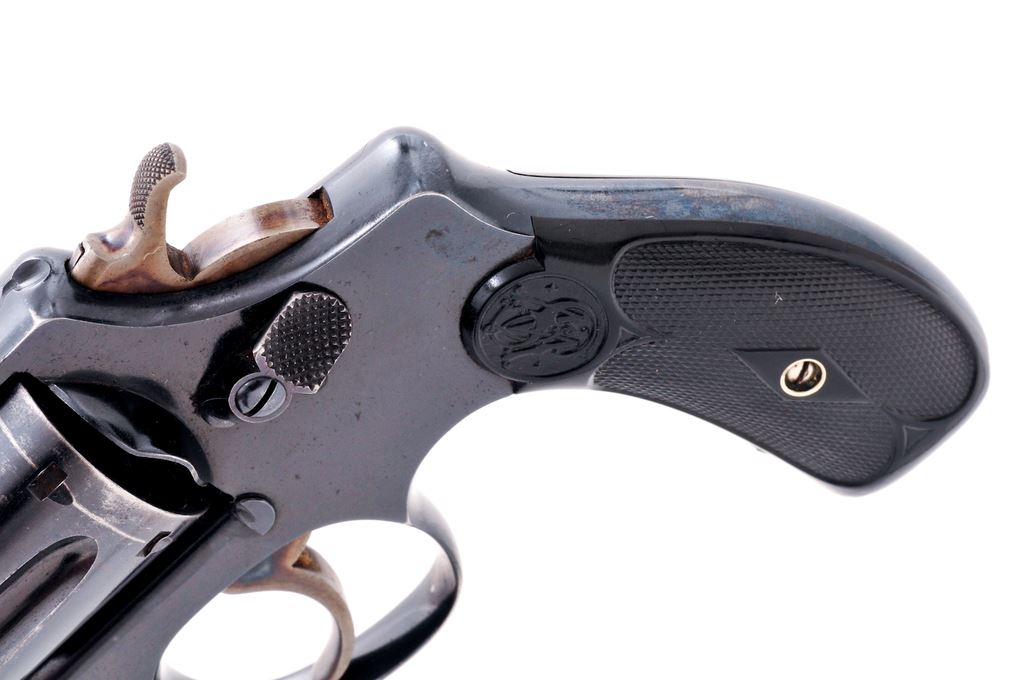Smith & Wesson Hand Ejector 2nd Model (Model of 1903) Double Action Revolver, #16725, .32 S&W long cal., 6-shot cylinder, 6'' pinned barrel, high polish blue finish, checkered black hard rubber grips, round blade front sight and standard notched frame rear sight. Also featuring a smooth case hardened trigger and finely checkered hammer. Mfg'd 1903-1904. Approx. 85%-90% blue finish remains and revolver rates as very good overall. Right side of frame with reddish brown freckling; muzzle with finish loss and some light surface peppering. Factory lettering is clear and well defined. Grips show moderate wear and scattered small handling marks to the flat borders; both are free of any chips or cracks. Hammer and trigger with 80%-85% case colors. Good action; bore with roughly ten intermittent spots of surface erosion and otherwise shiny and in good condition. Est.: $400-$600. (C&R)