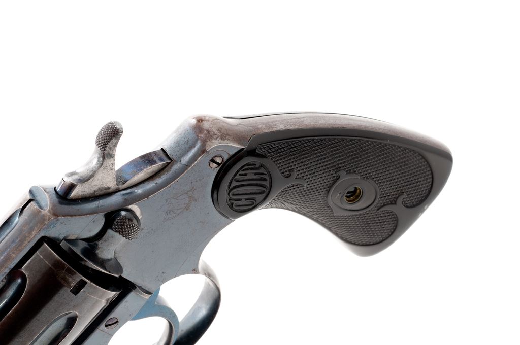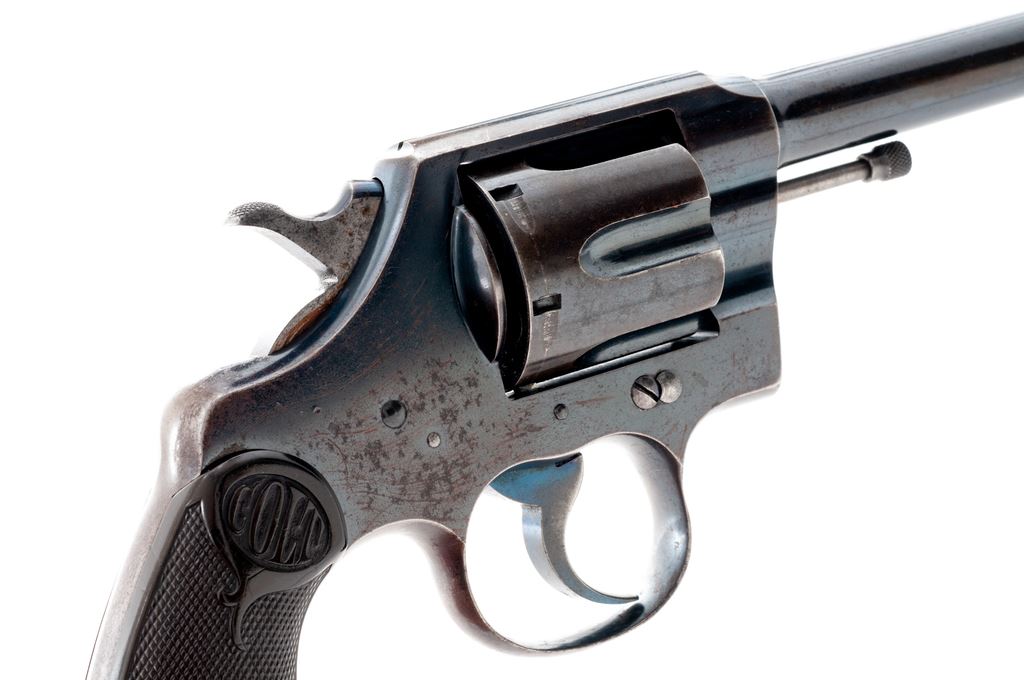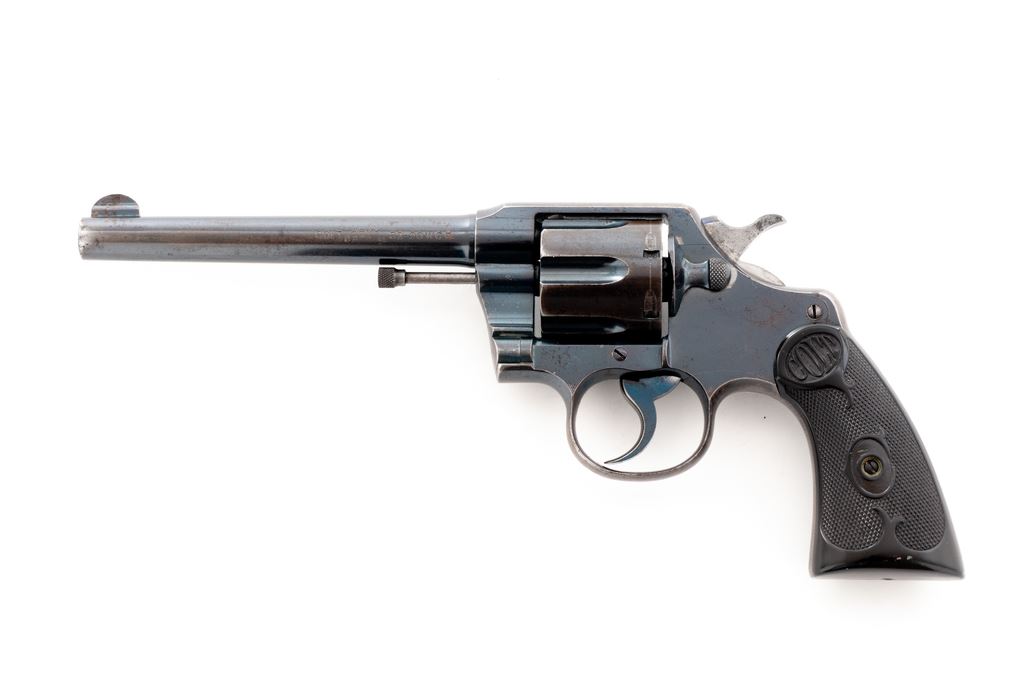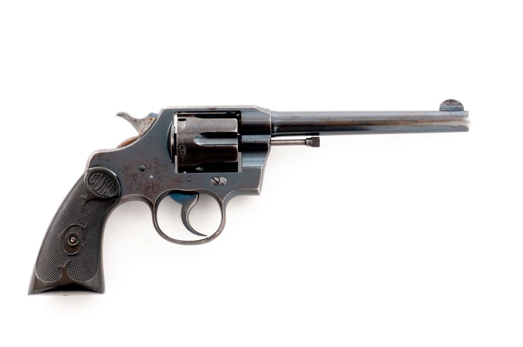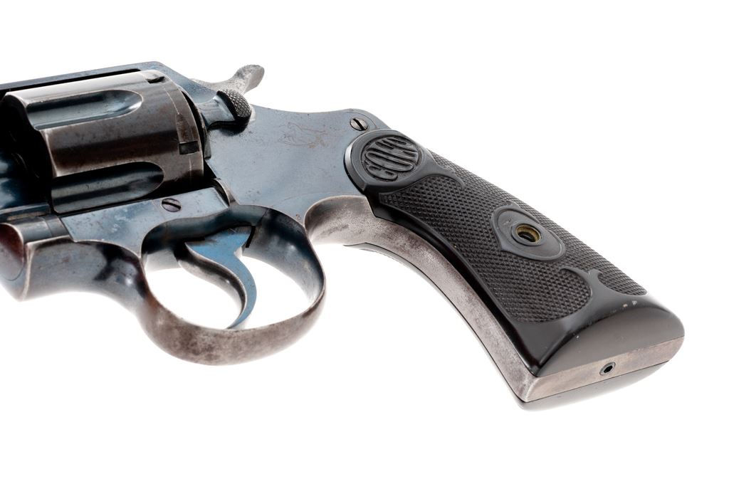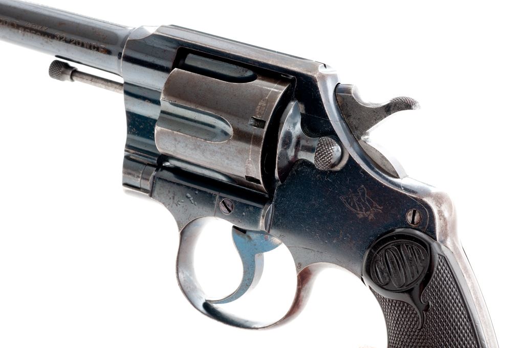 Colt Army Special Double Action Revolver, #310324, .32-20 cal., 6'' barrel, blue finish, factory checkered hard rubber grips. Mfg'd 1909. Condition is about fine retaining approx. 92%-96% original blue. Grips with mild even flattening. Lanyard loop has been removed. Good action, very good bore. Est.: $400-$600. (C&R/PPT)