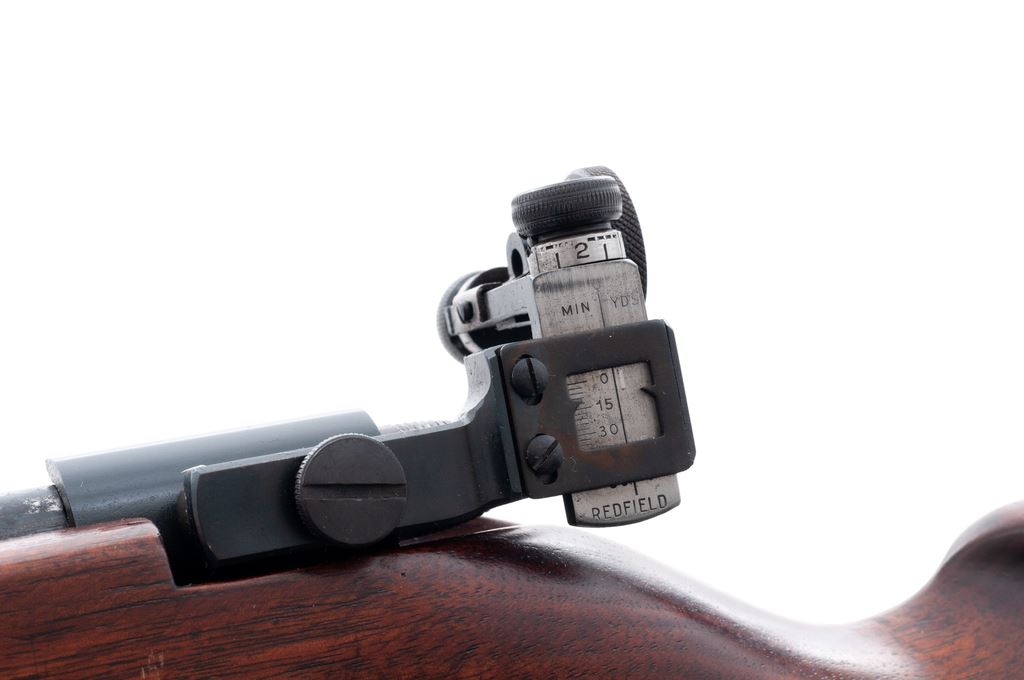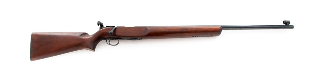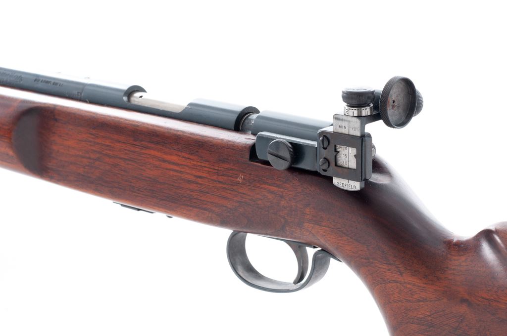 Remington 513-T Matchmaster Bolt Action Rifle, #78557, .22 S-L-LR cal., 27'' barrel, blue finish, smooth pistol-grip mahogany stock, checkered steel buttplate, Redfield target rear and hooded Redfield globe front sight. Condition is excellent. Blue surfaces retain approx. 97% finish. Stock with light general scuffs overall. Good action, excellent bore. Est.: $350-$500. (C&R)