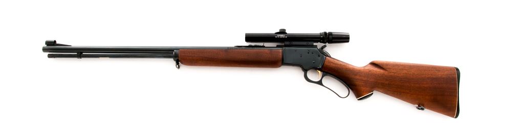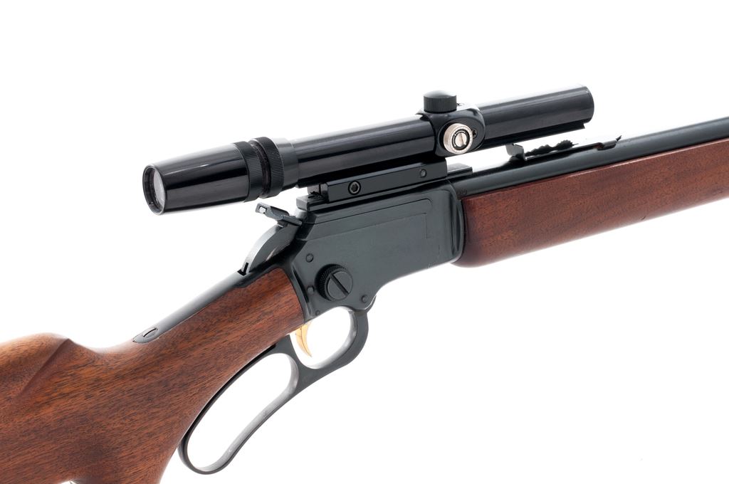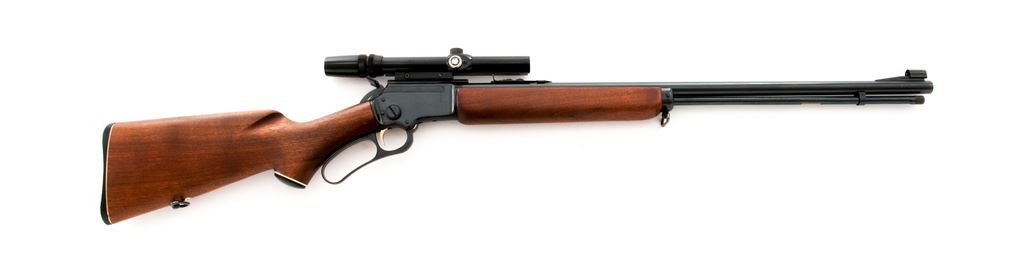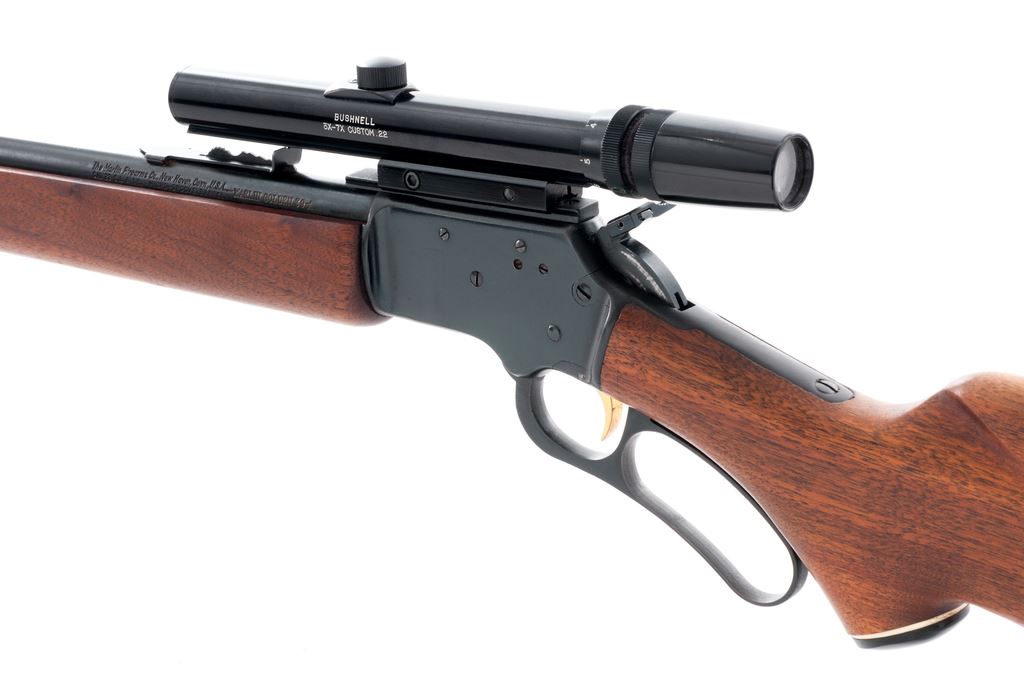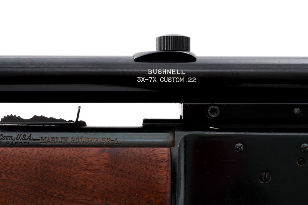 Early Marlin Golden 39-A Lever Action Rifle, #T25219, .22 S-L-LR cal., 24'' micro-grooved ''JM'' marked barrel, blue finish, hooded brass bead front sight, standard elevator rear sight, gold-plated trigger, and ''JM'' marked hammer extension. Oil-finished pistol-grip walnut stock with fluted comb, black composite Marlin buttplate, and sling swivels. Topped with a Bushnell ''Custom .22'' 3x-7x scope on a one-piece base; scope with a fine cross hair reticle. Mfg'd 1960. Approx. 96% original finish remains and metal surfaces rate as very good overall; receiver with a few shallow scratches; top of barrel around the rear sight and magazine tube with tiny specks of surface rust, most should clean up fairly easily. Factory lettering is clear and well defined. Wood is really nice for its age showing minimal handling marks, most noticeable being a small surface ding to the right side of the forend and some very shallow marks to the buttstock; wood fits tight at the adjoining metal surfaces. Crisp action with an excellent bore. Scope is also excellent with a few small scratches to the exterior, optics are clear. Est.: $400-$600. (C&R)