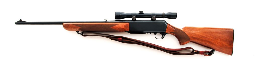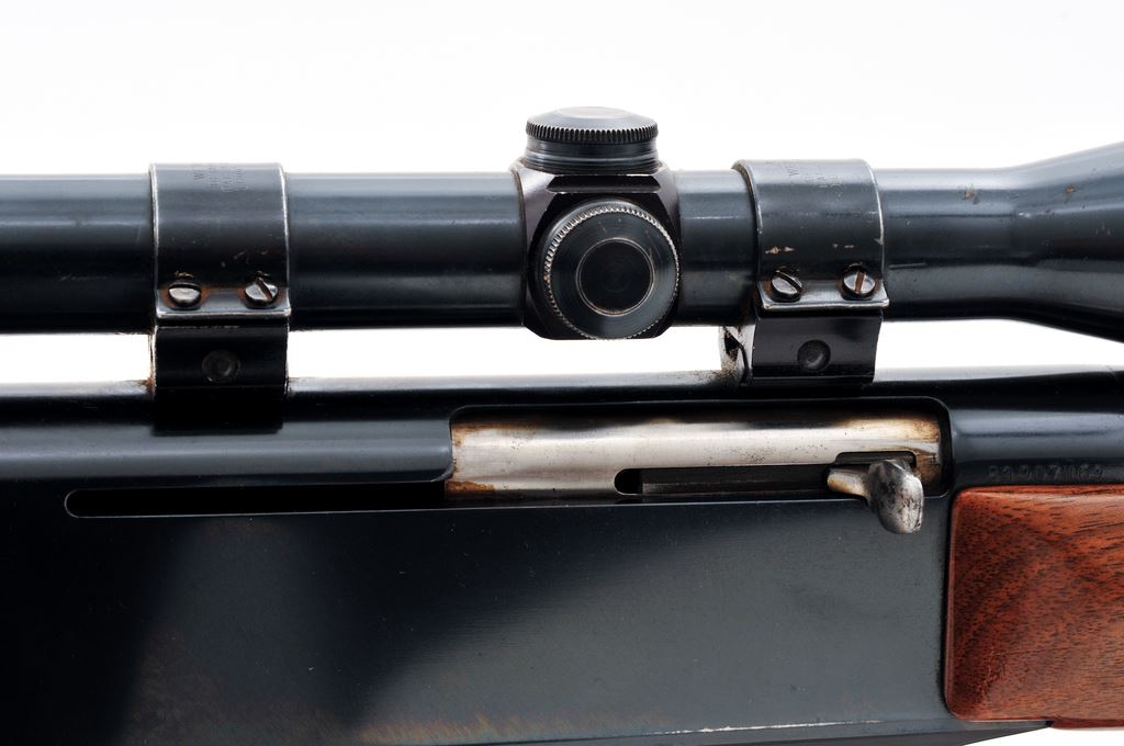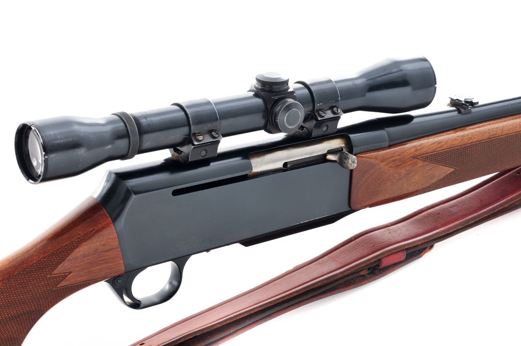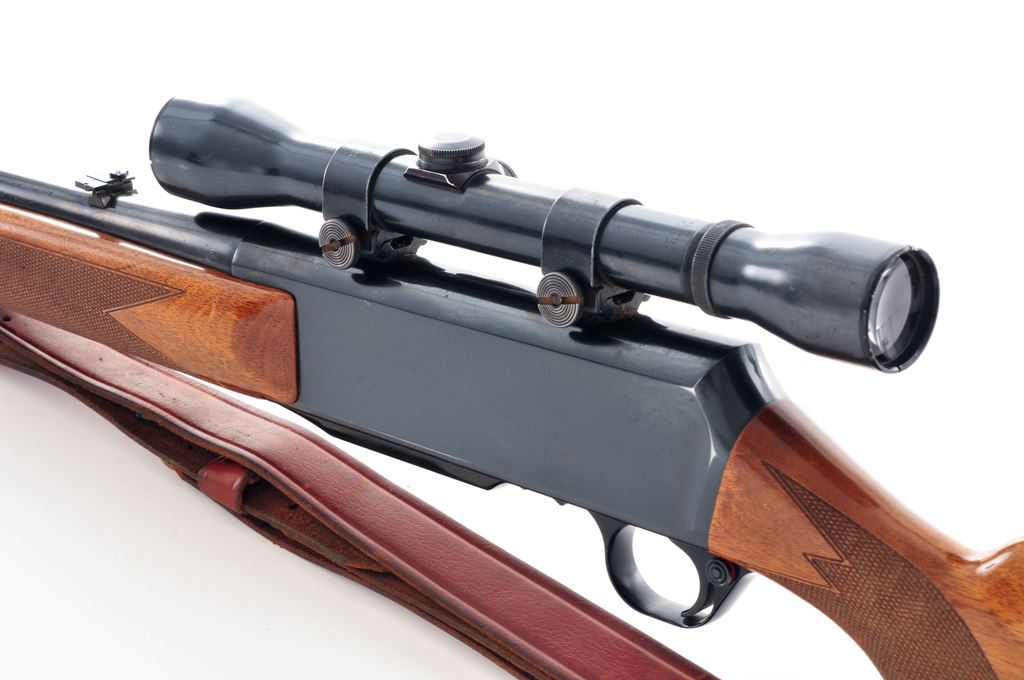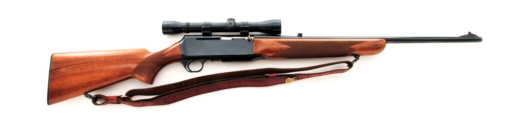 Grade I Belgian Browning BAR Semi-Automatic Rifle, #83907M69, .243 cal., 22'' barrel, blue finish, dovetailed brass bead front sight on ramped base, and folding rear sight. Checkered pistol-grip walnut stock with a semi-gloss finish, black composite Browning buttplate, sling swivels, and brown leather sling. Topped with a Weaver K4 scope and Weaver rings; scope with fine crosshair reticle. Mfg'd in 1969. Overall condition is very good+ showing signs of moderate field use. Approx. 96%-97% original finish remains with a spot of finish loss on top of barrel behind the front sight and a few spots of thinning to the highpoints of receiver. Wood with scattered shallow nicks and scratches; approx. 93%-95% of the semi-gloss finish remains with some thinning at wrist and forend; checkering is clean. Excellent smooth action and bright bore. Scope exterior shows moderate age and wear; optics are clear. Est.: $400-$600. (Modern)