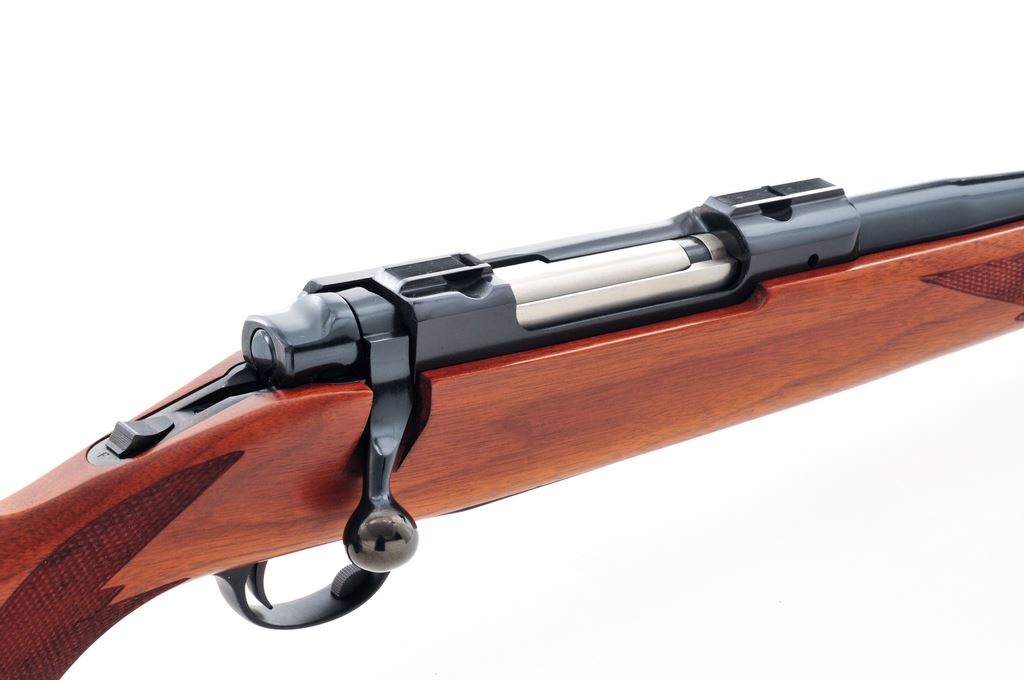 Ruger M77 Bolt Action Rifle, #78-07806, 7mm Rem. mag. cal., 24'' barrel, blue finish, checkered pistol-grip walnut stock, factory red rubber recoil pad, Ruger grip cap, sling swivel studs, brass bead front sight on fixed base, and folding rear sight. Condition is near excellent with approx. 97% original finish; finish loss to bottom of the sight base accounts for nearly all of the wear to the metal. Factory lettering is sharp. Stock shows only a few slight handling marks most noticeable along the bottom edge of the forend; checkering is clean. Excellent smooth action and clean bore that shows signs of little use. Est.: $400-$600. (Modern)