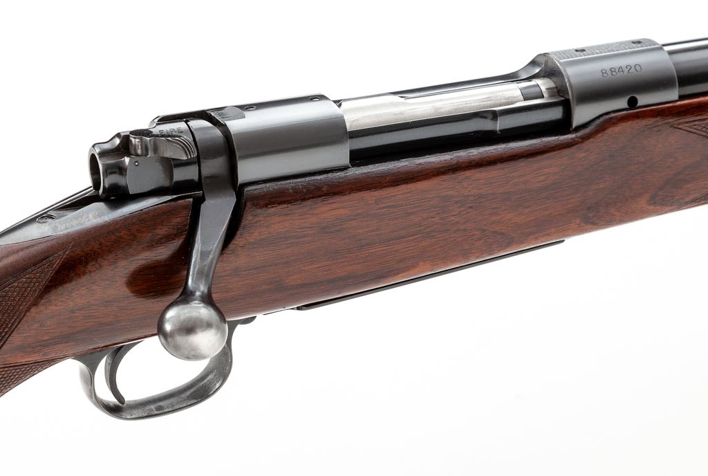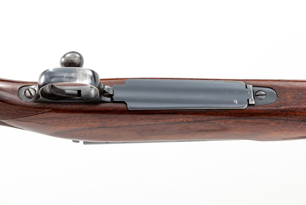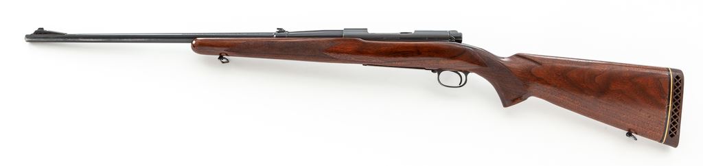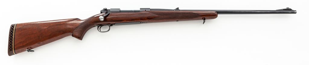 Pre-64 Winchester Model 70 Bolt Action Rifle, #88420, .30-06 cal., 24'' barrel, blue finish, factory checkered walnut stock, with Pachmayr rubber butt pad. Original factory sights are retained; missing front sight hood. Mfg'd 1948. Condition is about fine. Metal surfaces retain approx. 94% lightly thinning blue, with most of the losses to triggerguard and magazine floorplate. Stock with light general impressions from field use, with an additional coat of linseed oil at one point. Light losses at pistol grip cap area. Good action, bright bore. Est.: $500-$750. (C&R)