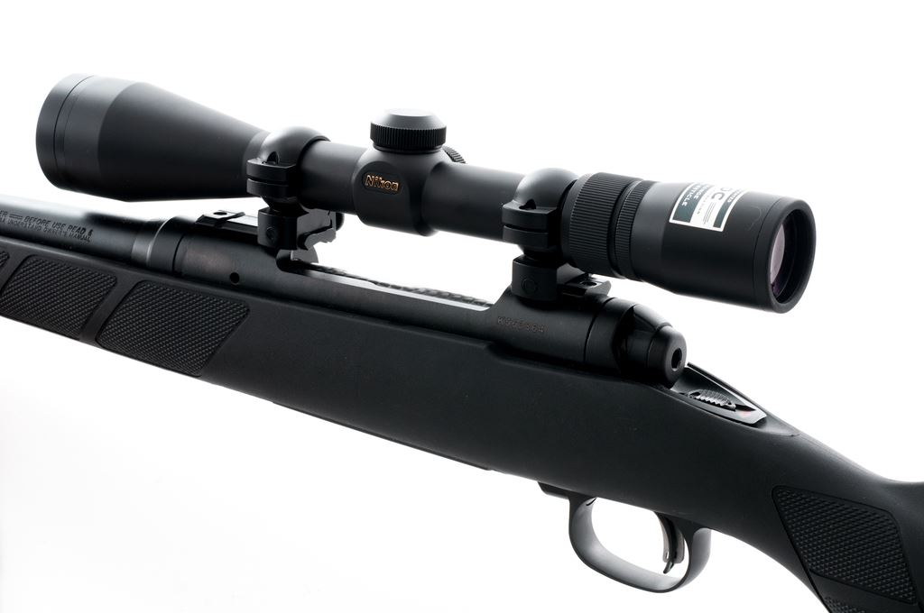 Savage Model 111 Trophy Hunter XP Package Bolt Action Rifle, with Nikon scope, #K563864, .30-06 cal., 22'' barrel, matte black finish, checkered synthetic pistol-grip stock, black rubber pad, sling swivels, padded sling; stock with a black elastic cartridge holder. Also featuring a detachable box magazine and AccuTrigger. Topped with a Nikon BDC 3-9x40 scope that was part of the Trophy Hunter XP package; scope with a long range hunting reticle. In original Savage box (no end label), with soft scope cover, cable lock, owner's manual, and other misc. factory paperwork. Rifle and scope are in excellent near new overall condition. All of the original matte black finish remains. Stock with a few light scratches to the buttstock and handling marks below the receiver. Smooth crisp action and excellent bore. Scope appears as new with bright, clear optics. Est.: $350-$550. (Modern)
