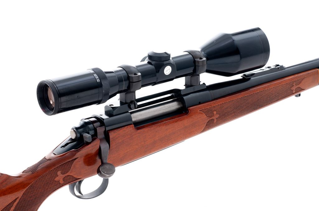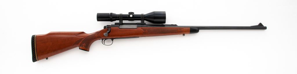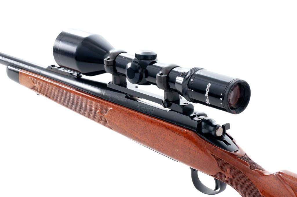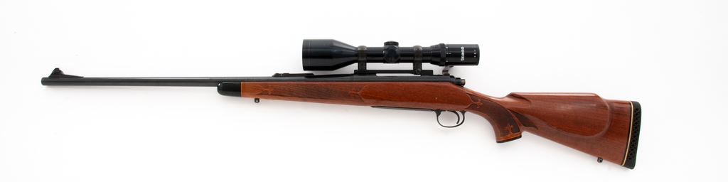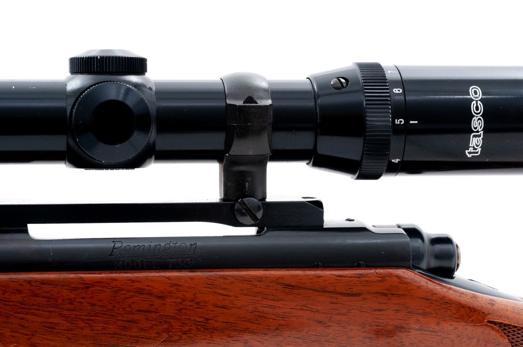 Remington Model 700BDL Deluxe Bolt Action Rifle, with Tasco scope, #160936, 7mm Rem. mag. cal., 24'' barrel, blue finish, hinged floorplate, ramped brass bead front sight, only rear sight base is present. One-piece walnut stock with gloss finish, fleur-de-lis checkering at the pistol grip and forend, Monte Carlo cheekpiece, black forend cap, vented black rubber Remington recoil pad, and smooth composite grip cap. Fitted with a Tasco 3-12x52 and Redfield mount; scope with duplex reticle. Metal surfaces rate as near excellent with approx. 95% original finish, with a majority of the finish loss being thinning to the floorplate; left side of receiver with a few slightly lighter spots on the finish. Factory lettering is clear, with a small set of the initials ''CJM'' having been scratched into the floorplate. Stock is very good and retains a majority of the gloss finish, with signs of moderate field use including scattered shallow handling marks; edges of cheekpiece show minor thinning. Action is smooth with an excellent bright bore. Scope is near excellent and shows only minor marks to the exterior, optics are bright and clear. Est.: $500-$700. (C&R)