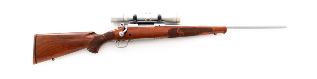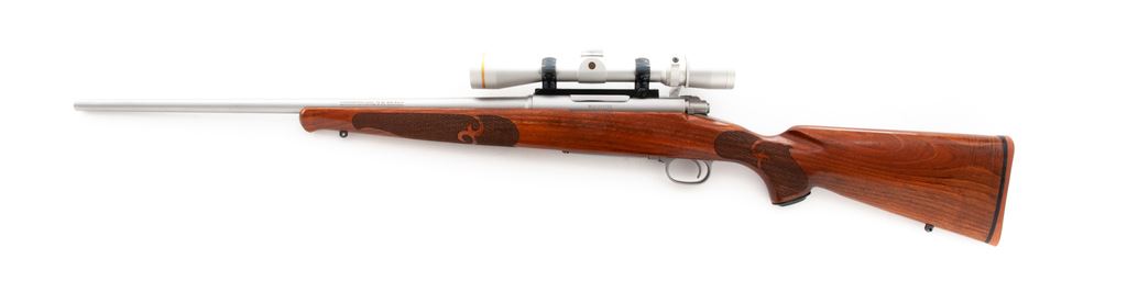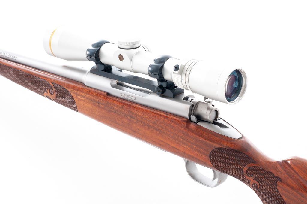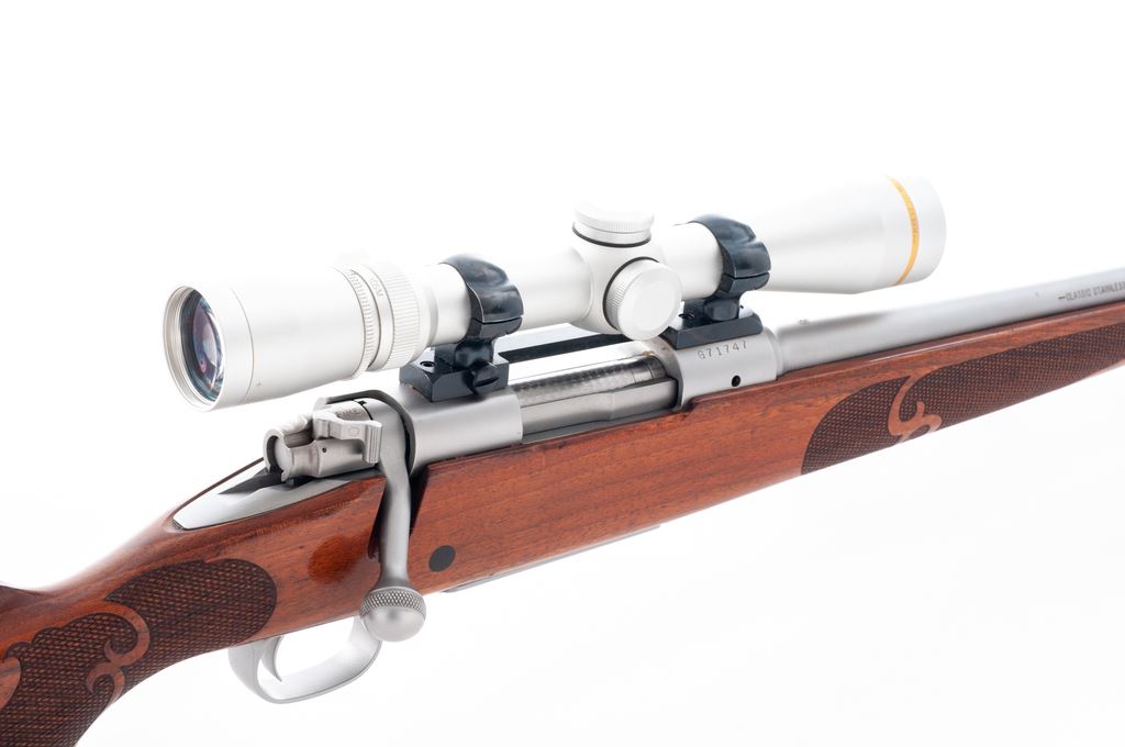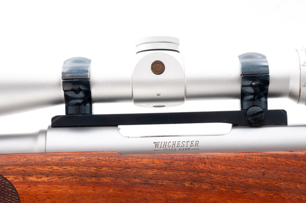 Winchester Model 70 SA Classic Bolt Action Rifle, with Leupold scope, #G71747, .308 cal., 22'' barrel, matte stainless finish, checkered pistol-grip walnut stock with Schnabel forend, red rubber Winchester recoil pad, and sling swivel studs. Topped with a matte silver Leupold VX-III 2.5-8x36mm scope and blued steel Redfield mount; scope with duplex reticle. Metal surfaces are excellent with a few light handling marks; factory lettering is sharp. One-piece stock with clean checkering and some small impressions and normal minor marks from field use. It does appear that the stock was re-oiled and unfortunately was not kept clean, as there are some fine dust particles and fibers imbedded in the finish. Action is smooth with a bright excellent bore. Scope appears near new with bright, clear optics. Est.: $500-$700. (Modern)