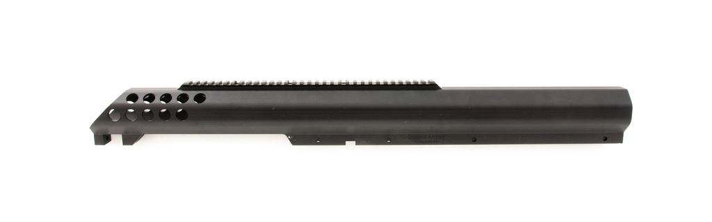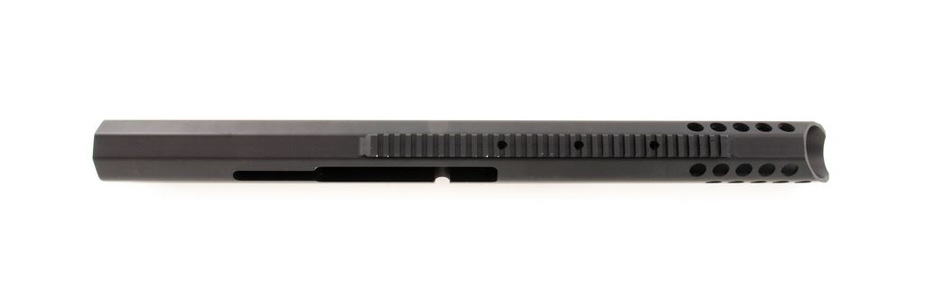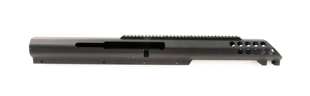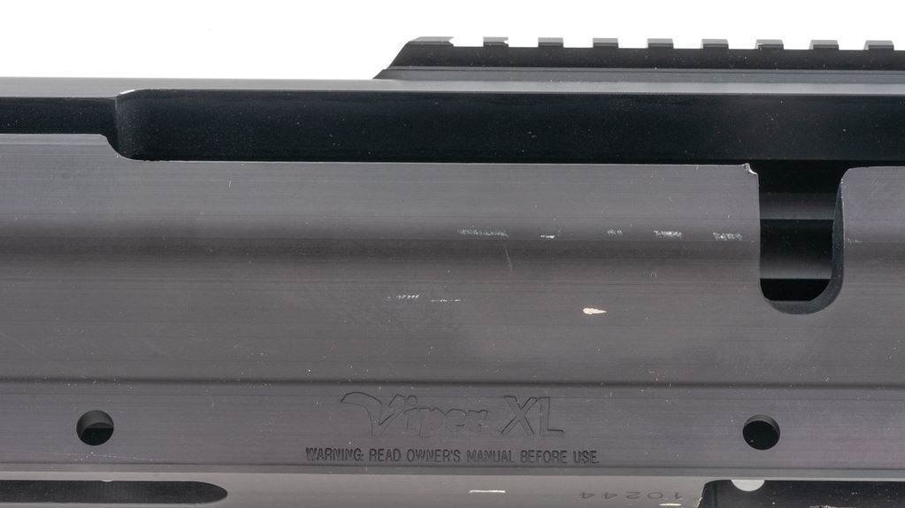 Bluegrass Armory VIPER XL Large Caliber Rifle Frame, single shot bolt action, #10244, black anodized finish, integral 30 MOA Picatinny style rail. Frame is all one piece, no welded parts or components. Appears to be new-old stock in very good condition, with handling marks along side of frame, and small dents and scratches on bottom rail, a portion of Picatinny rail, and a dent on corner edge of bolt slot. Est.: $600-$800. (Modern)